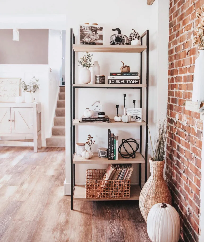 Plaid pumpkins and tiny topiaries perch alongside fashion tomes and a basket of records, so yes, it’s stylish and it actually lives a life. The open shelves keep everything airy, and that big floor vase anchors the corner like a grown-up.