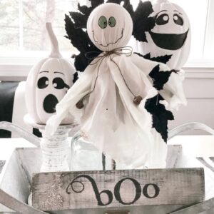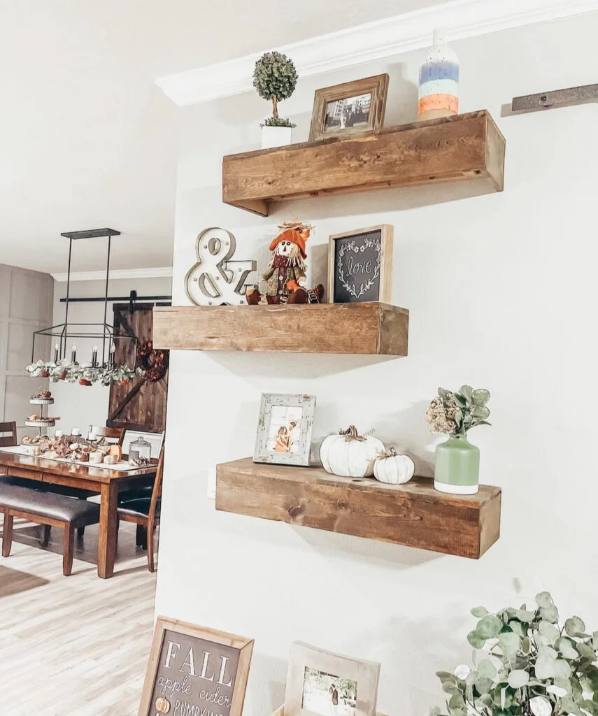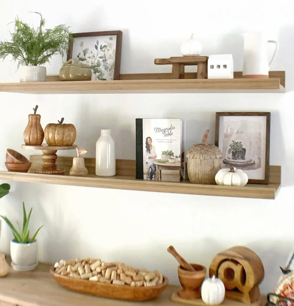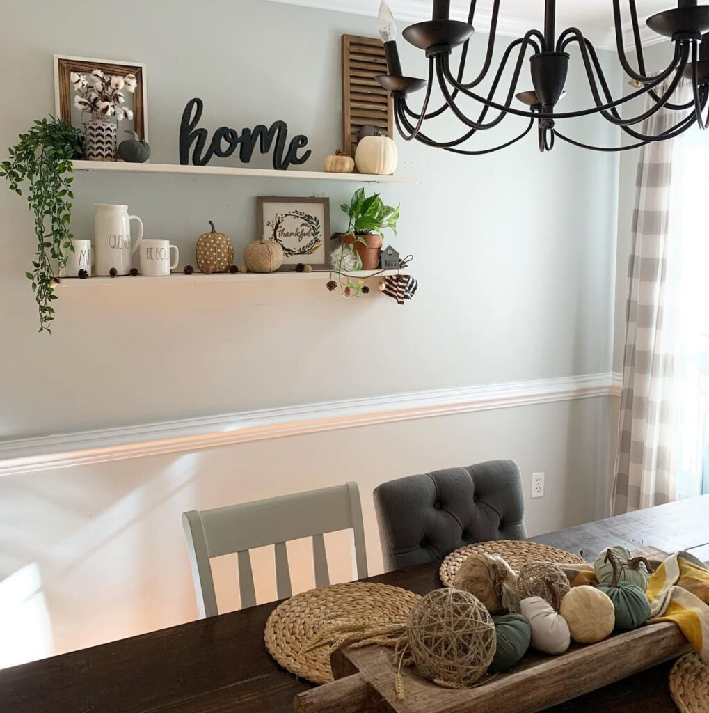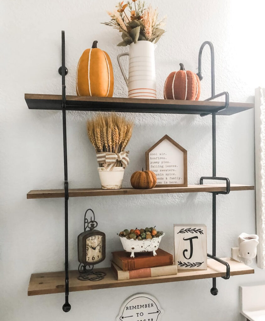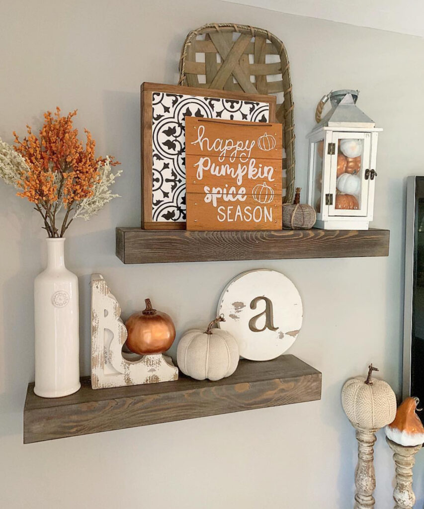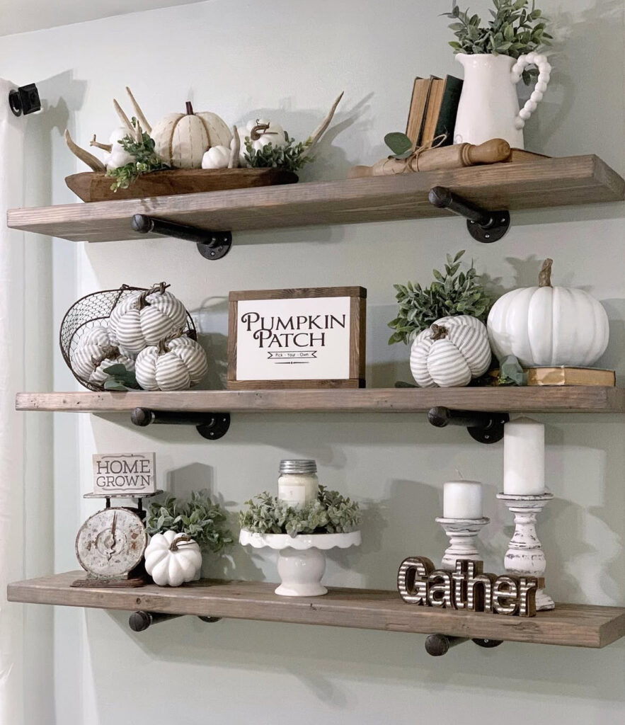 Those thick floating shelves carry a whole personality: marquee ampersand, tiny topiary, a scarecrow that refuses to be subtle, and creamy pumpkins for balance. It’s cheerful and a little nostalgic, the decor equivalent of caramel apples after school.