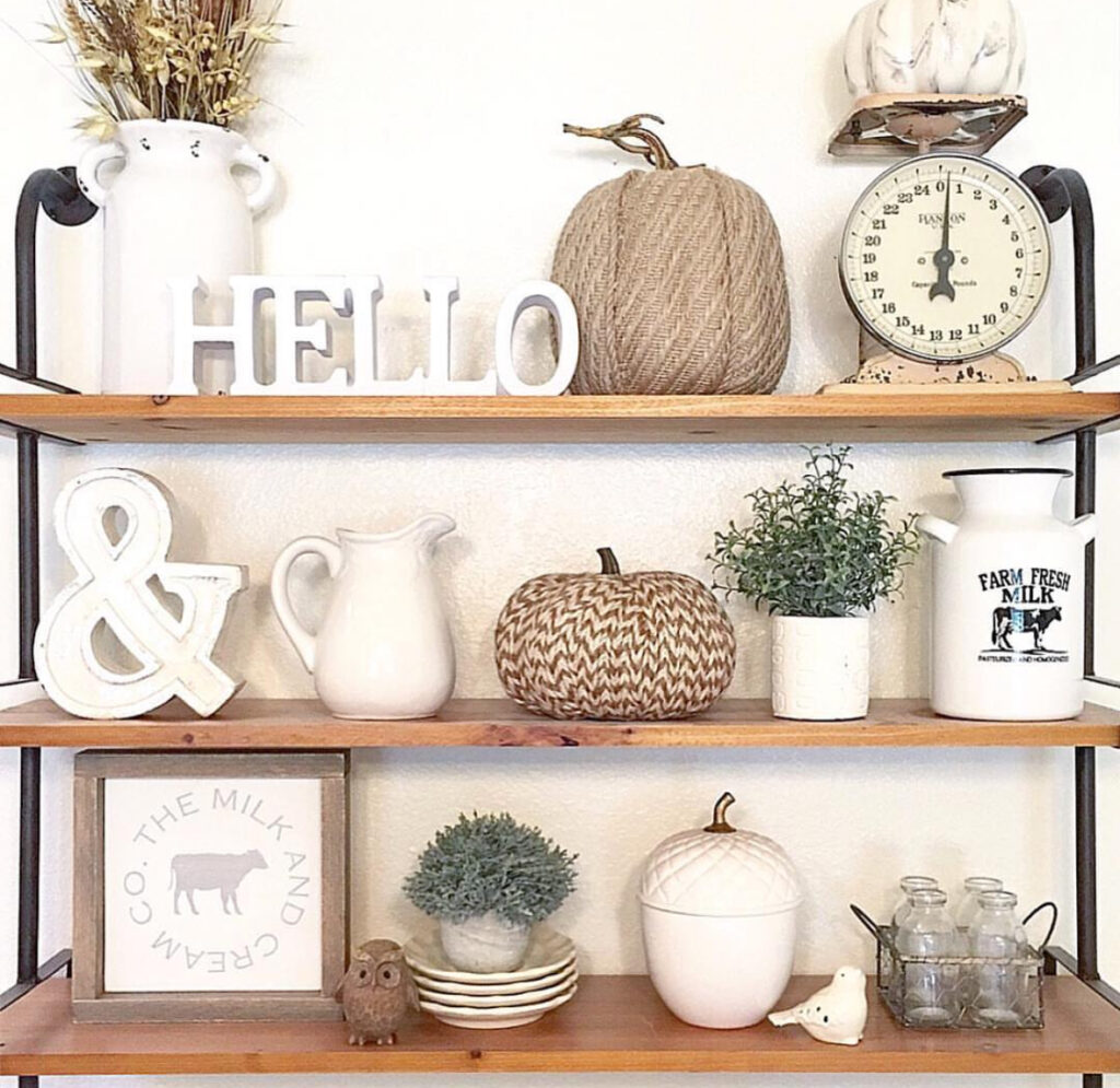 A twine pumpkin on vintage scales next to milk jugs and greenery feels like the farmers market decided to write a love letter to your wall (with excellent penmanship). It’s approachable, sweet, and a masterclass in fall decor for shelves that doesn’t require a single power tool.