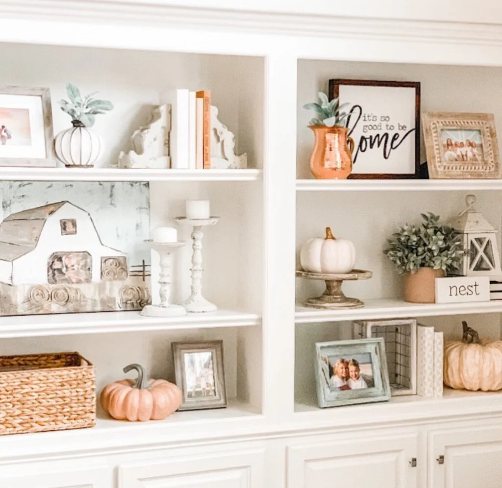 These bright built-ins whisper fall instead of yelling it—soft pumpkins, copper glints, a barn painting, and family photos doing the heavy lifting of “home.” It’s calm, collected, and proof that fall decor ideas for shelves don’t need to be loud to feel seasonal (a relief for the neutral lovers).