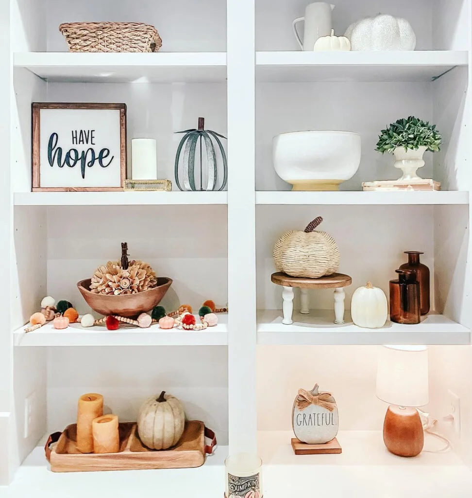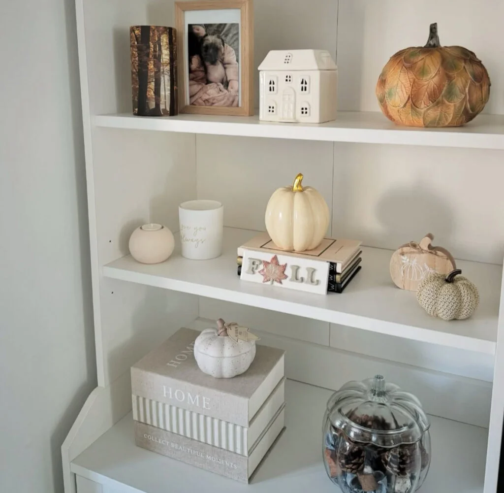 Every September I get the itch to rearrange the shelves (the same way I swear I’m becoming a morning person and then immediately hit snooze), because once the air turns crisp those bare stacks beg for sweaters and pie. I start pulling out pumpkins from bins like a magician with scarves—ceramic, knitted, the raffia one I inexplicably named “Harold”—and somehow a cinnamon candle lights itself.