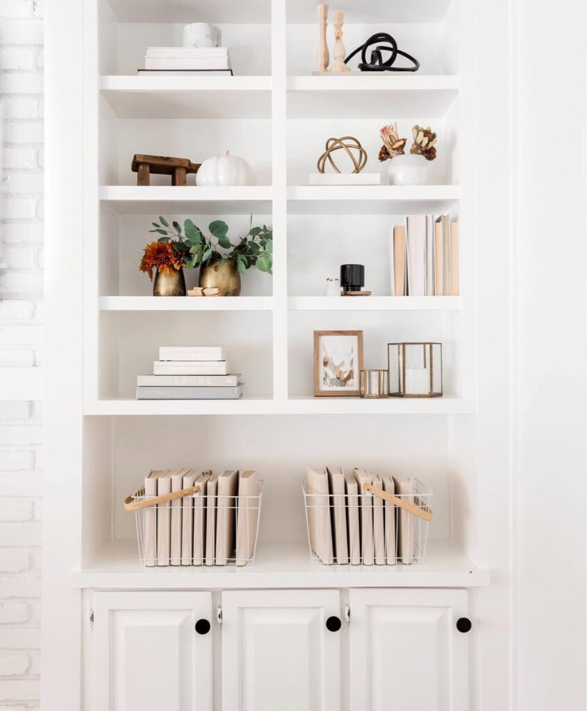 This white built-in is basically a capsule wardrobe for home—gold accents, soft greenery, and just enough pumpkins to whisper “autumn.” The labeled baskets on the bottom do the invisible labor so the top can look breezy (we love a multitasker).
