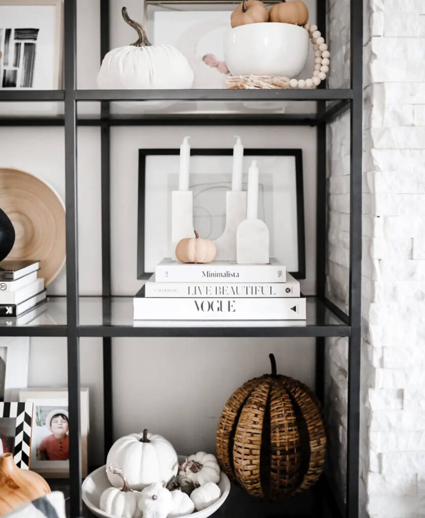 Black metal framing, stacks of pretty coffee-table books, and soft neutral pumpkins—cool, calm, and just the right dose of seasonal without singing carols in September. If you’re craving chic with a wink, pin this under “fall shelf ideas I’ll actually try.”