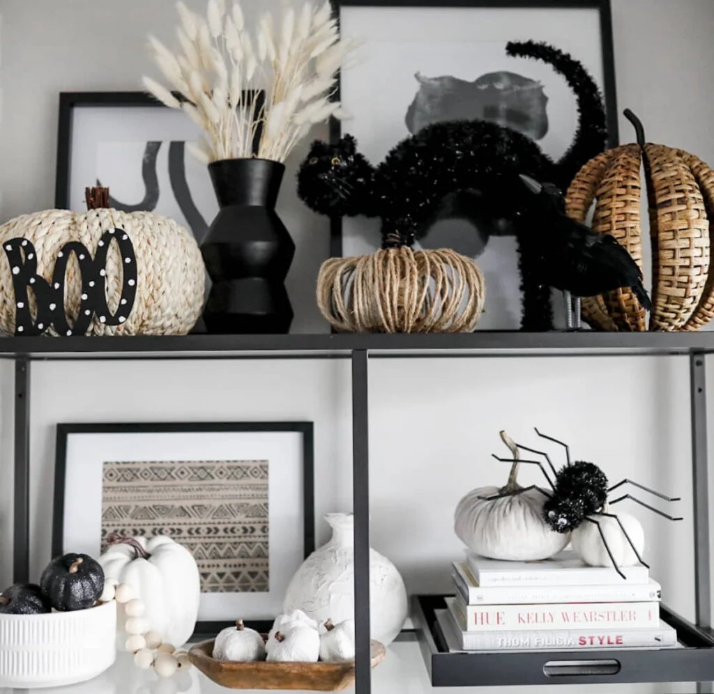 Black-and-cream everything, with rattan and twine pumpkins for texture, plus a sassy cat and glittery spider keeping watch—festive without the sugar rush. Layered art and coffee-table books make it feel grown-up, and the little crow on the edge is the dramatic friend we all secretly adore.