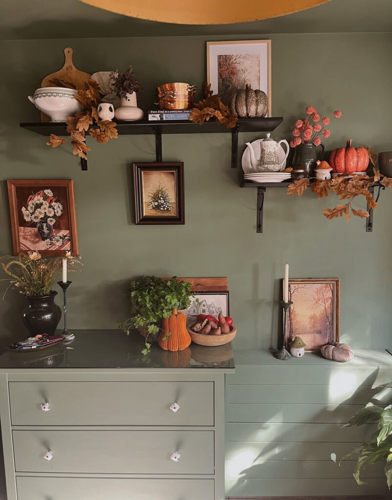 The deep green backdrop makes everything—copper pot, vintage art, chunky pumpkins, and those oak branches—look like it belongs in a cozy museum of soup and stories (I would happily buy a ticket). It’s collected without feeling cluttered, the exact kind of fall living room shelf decor that convinces me to light a candle and pretend emails don’t exist.