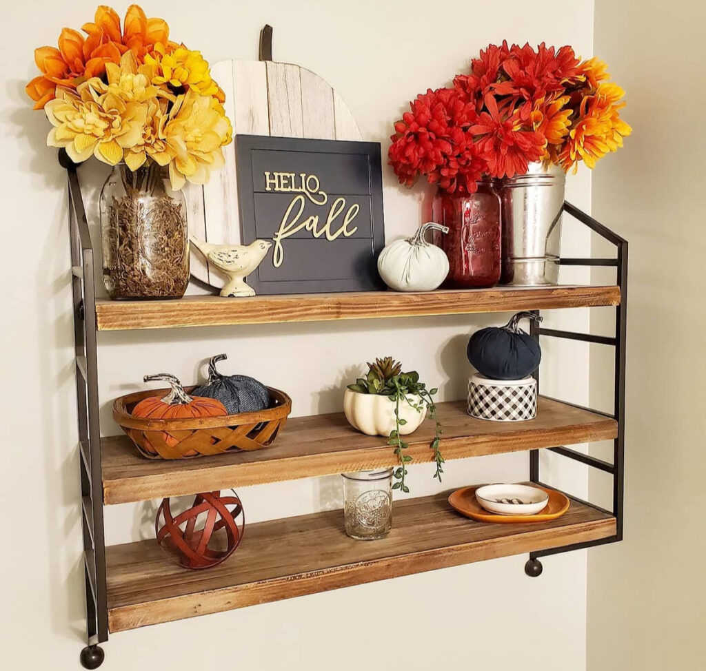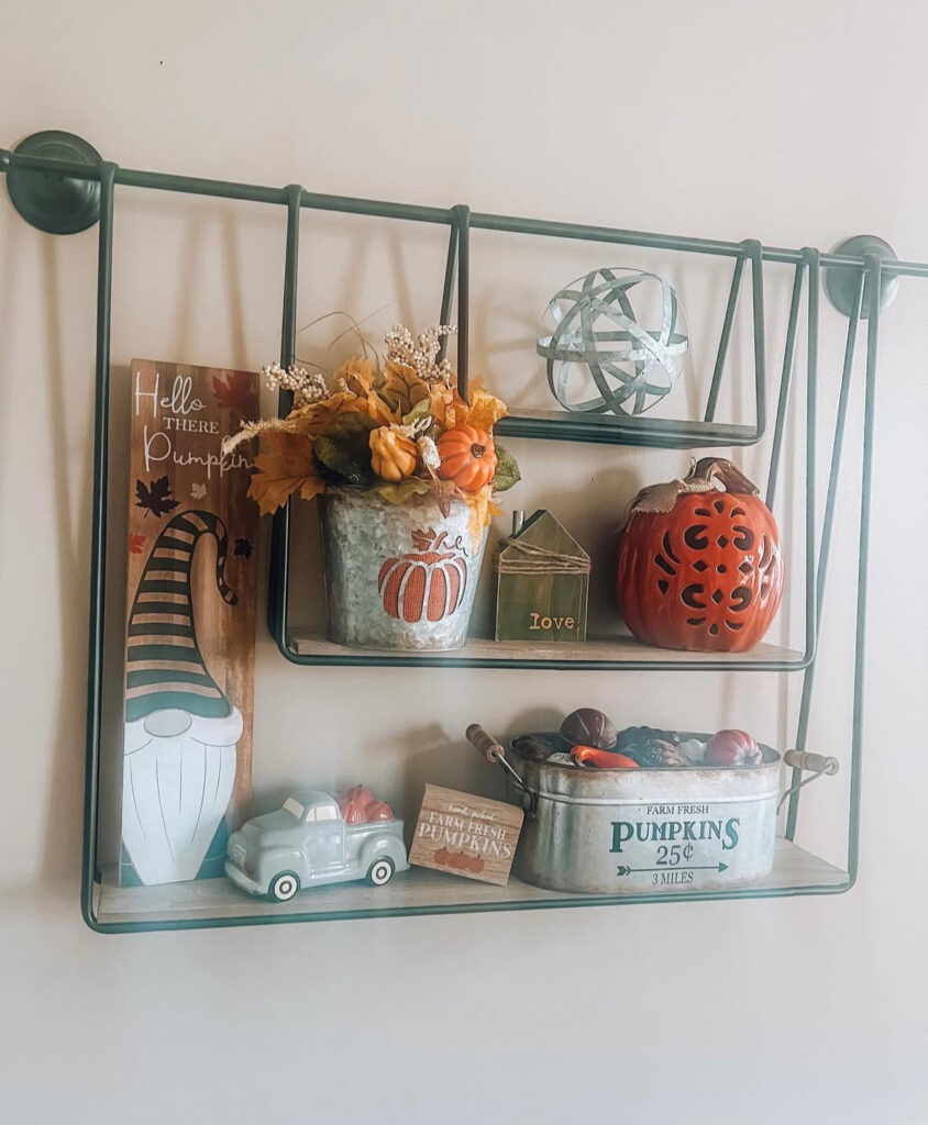 Metal brackets, wheat bundles, and chunky pumpkins—like your favorite flannel, but in shelf form. The vintage clock and little house sign make it feel collected over time (aka not trying too hard, which is my favorite aesthetic).