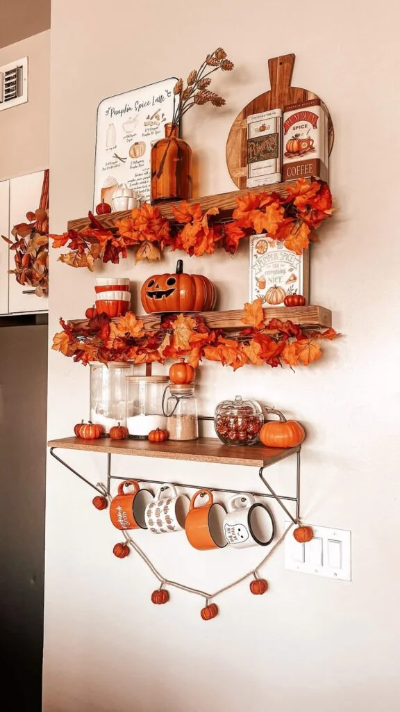 This little coffee setup shows up like the friend who brings pie and also organizes the carpool, all orange leaves and grinning pumpkins layered on warm wood, and I swear the mugs are lining up for roll call. The recipe board and jars keep it practical (because caffeine is a love language), and it’s basically my north star for fall kitchen shelf decor.