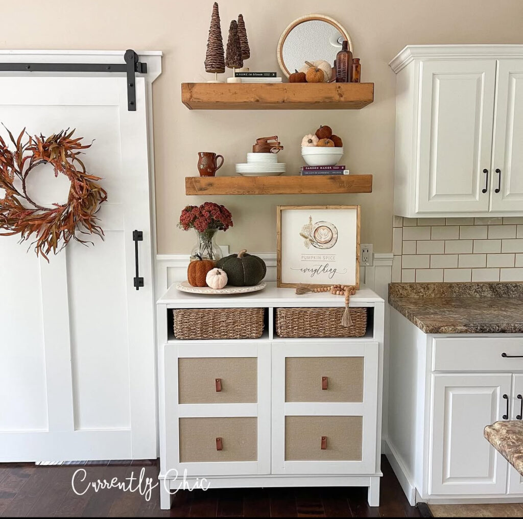 Stacked floating shelves over the cabinet make room for velvet pumpkins, little tree cones, and a framed “pumpkin spice everything” that, frankly, speaks my truth. With baskets tucked below and a wreath winking from the barn door, it’s the kind of fall living room shelf decor that makes you want to light a candle and pretend the laundry doesn’t exist (just for tonight).