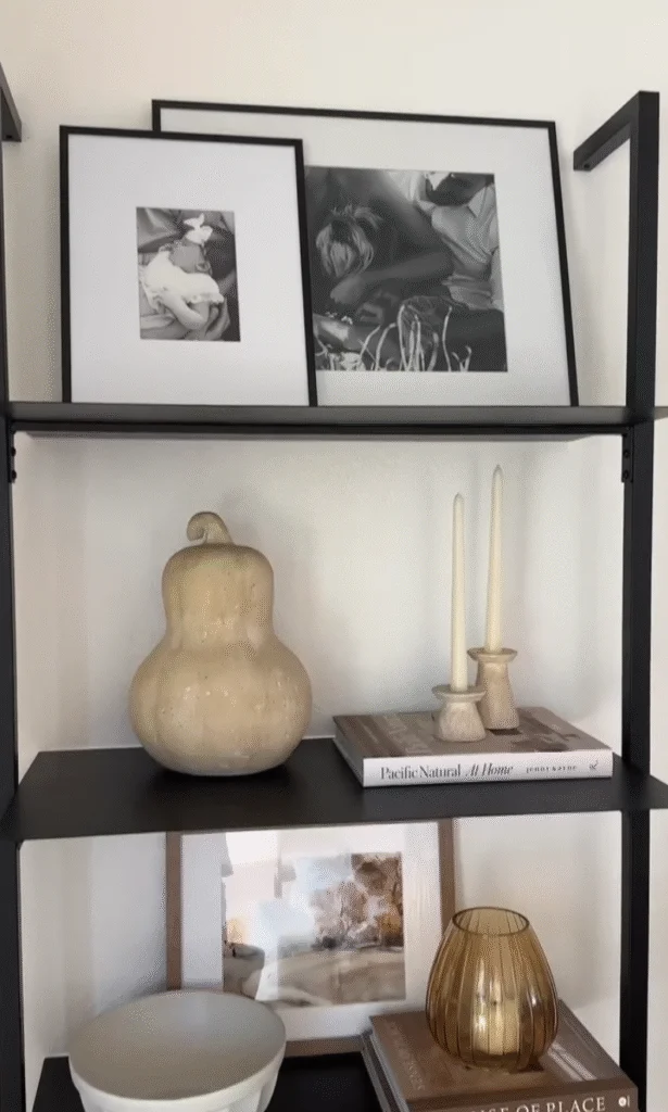 Black-framed shelves ease into autumn with a sculptural gourd, pale candlesticks, an amber glass, and a moody landscape perched on pretty stacks. In the middle of the styling, Julie Anne (@julieannehome) proves the “swap your art and add one warm piece” rule works every time—simple, chic, zero chaos. It’s the kind of understated glow that makes the room exhale.