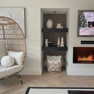 Tell me you like pretty storage without telling me…that black arched cabinet is doing ALL the talking. The light desk, the round jute rug, the soft chair, and that geometric wall = so calm / so styled. And can we talk about the greenery on the door + ceiling?! (small detail, big payoff)