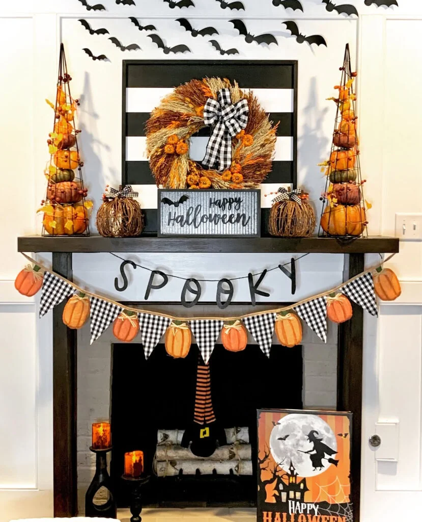 Gingham bows, striped backdrop, and pumpkin topiaries prove you can go full October without slipping into chaos. The “SPOOKY” garland and witch legs are pure theater, a playful riff on spooky Halloween mantel ideas that kids and grown-ups will both claim as their favorite.