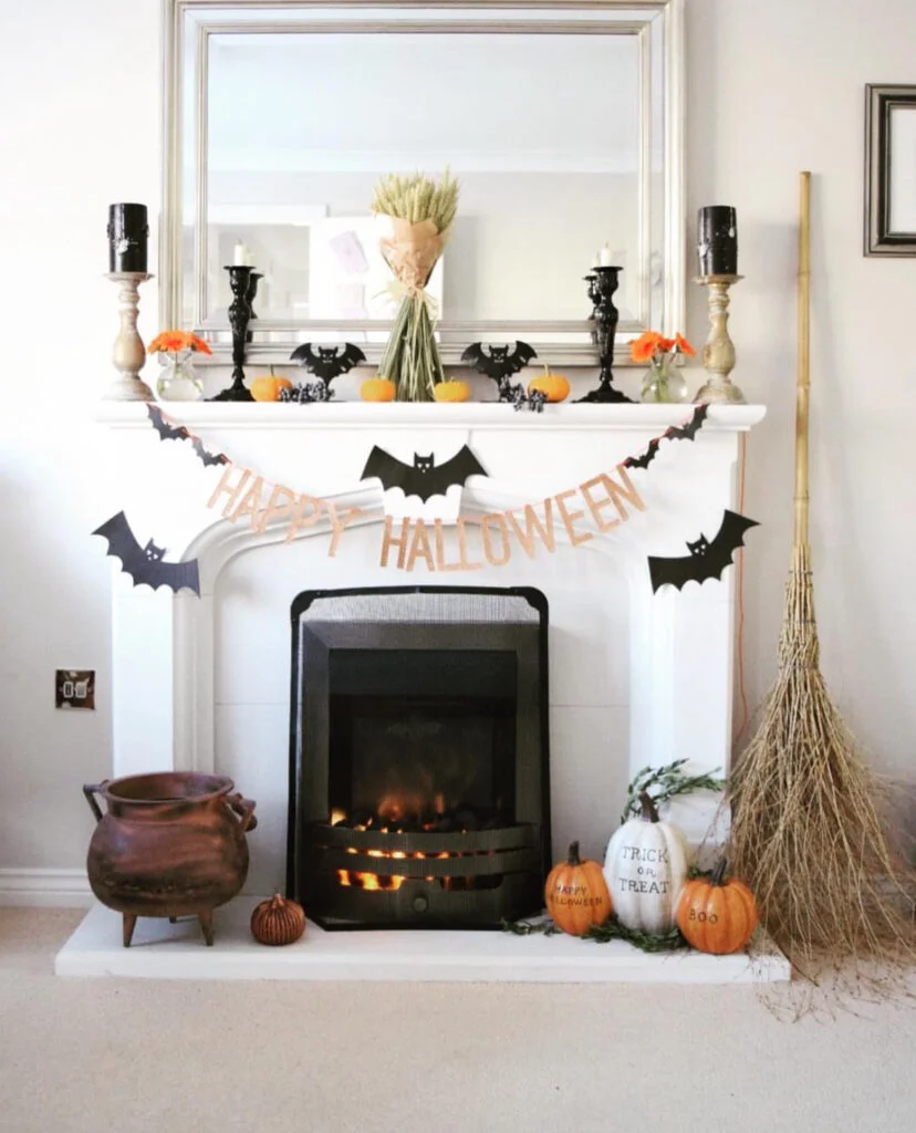 Proof that you can whisper “October” and still be heard: a round mirror, a tumble of paper bats, brass candlesticks, and one punchy banner. Consider it the mood board for simple Halloween mantel ideas that won’t hijack your living room for a month.