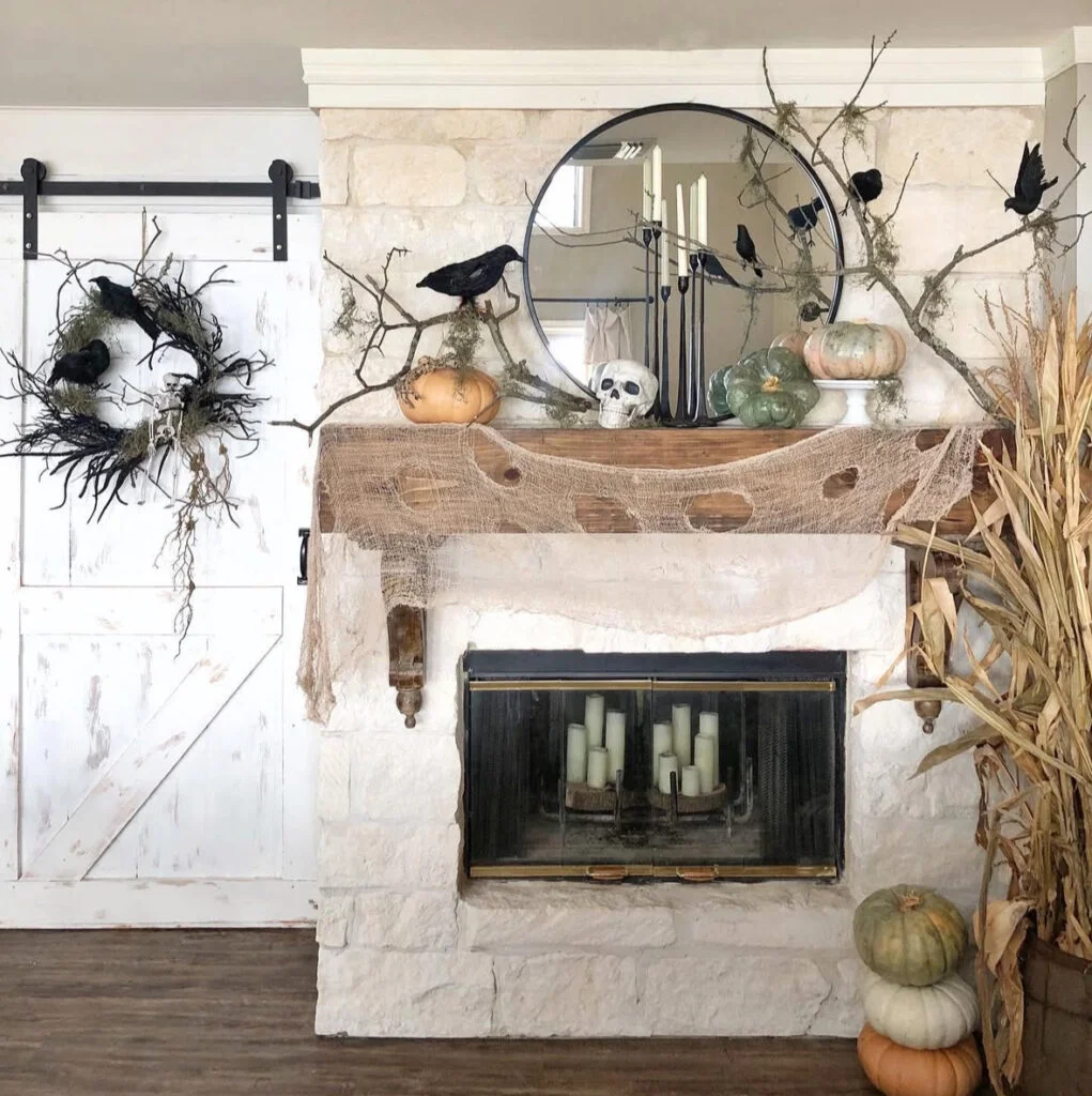 Weathered branches arc across the mantel, crows perched like they own the deed, while a single skull keeps the narrative clear. It’s restrained, textural, and oddly elegant—prime Halloween mantel decorating ideas fodder.