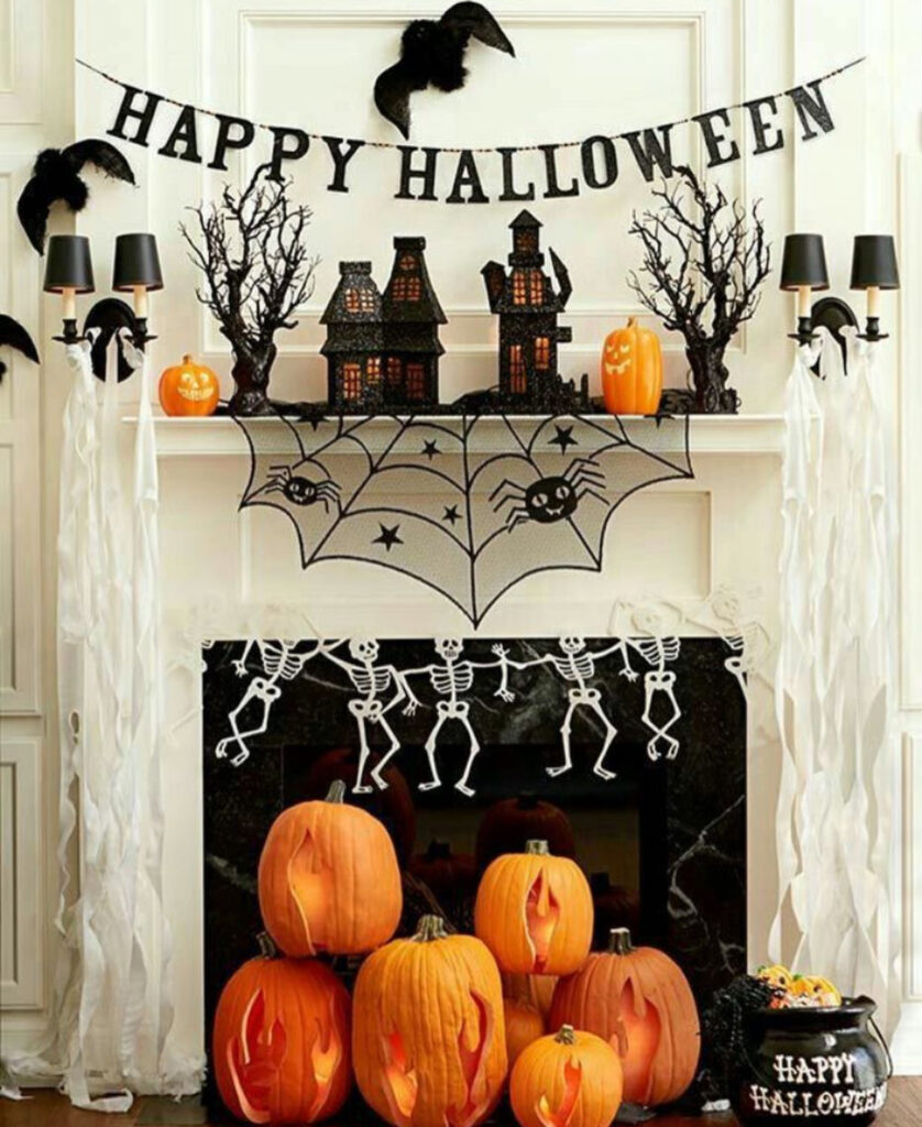 A banner, a spider-web runner, and a conga line of cut-paper skeletons—this one leans camp in exactly the right way. The stacked jack-o’-lanterns do the heavy lifting, giving you an instant party vignette and a foolproof template for fireplace Halloween decorating ideas that photograph like a dream.