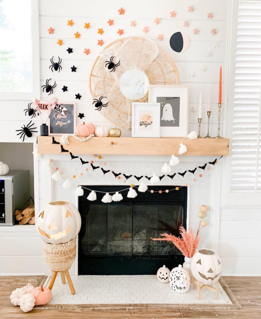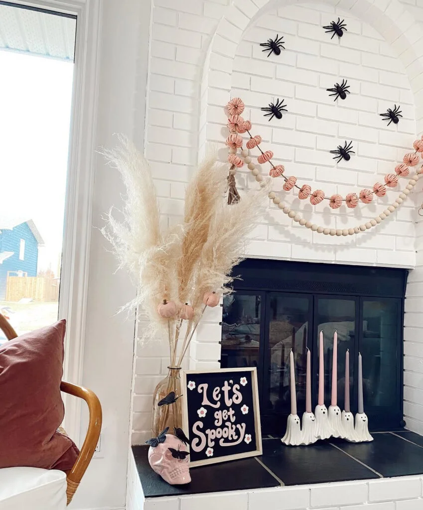 Pastels, tassel garlands, and a rattan mirror—proof that October can be soft-serve sweet and still wink at the haunted stuff. The oversized spiders keep it from drifting into pure nursery, landing squarely in the “fun, not fussy” camp of fireplace decor ideas.