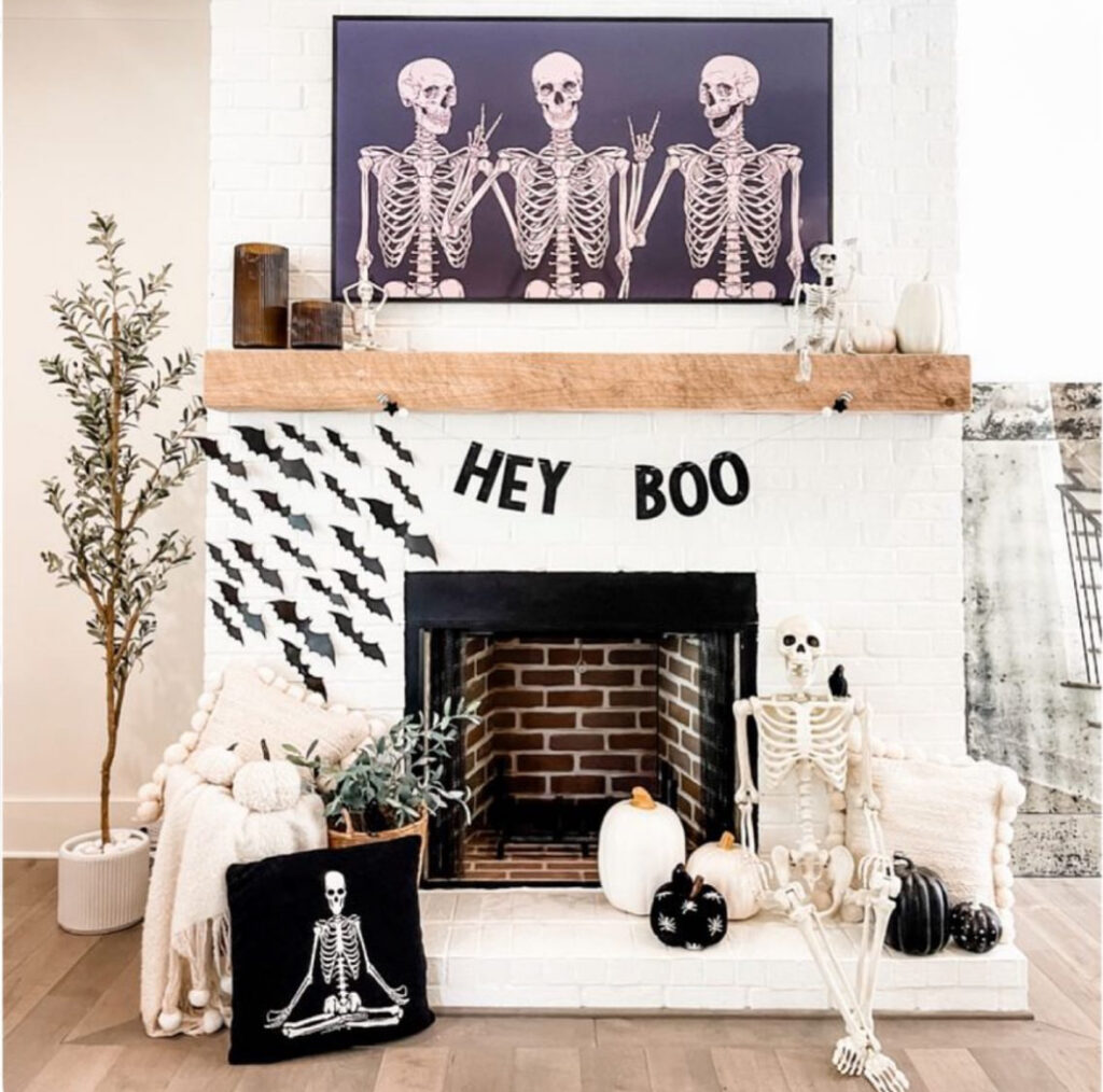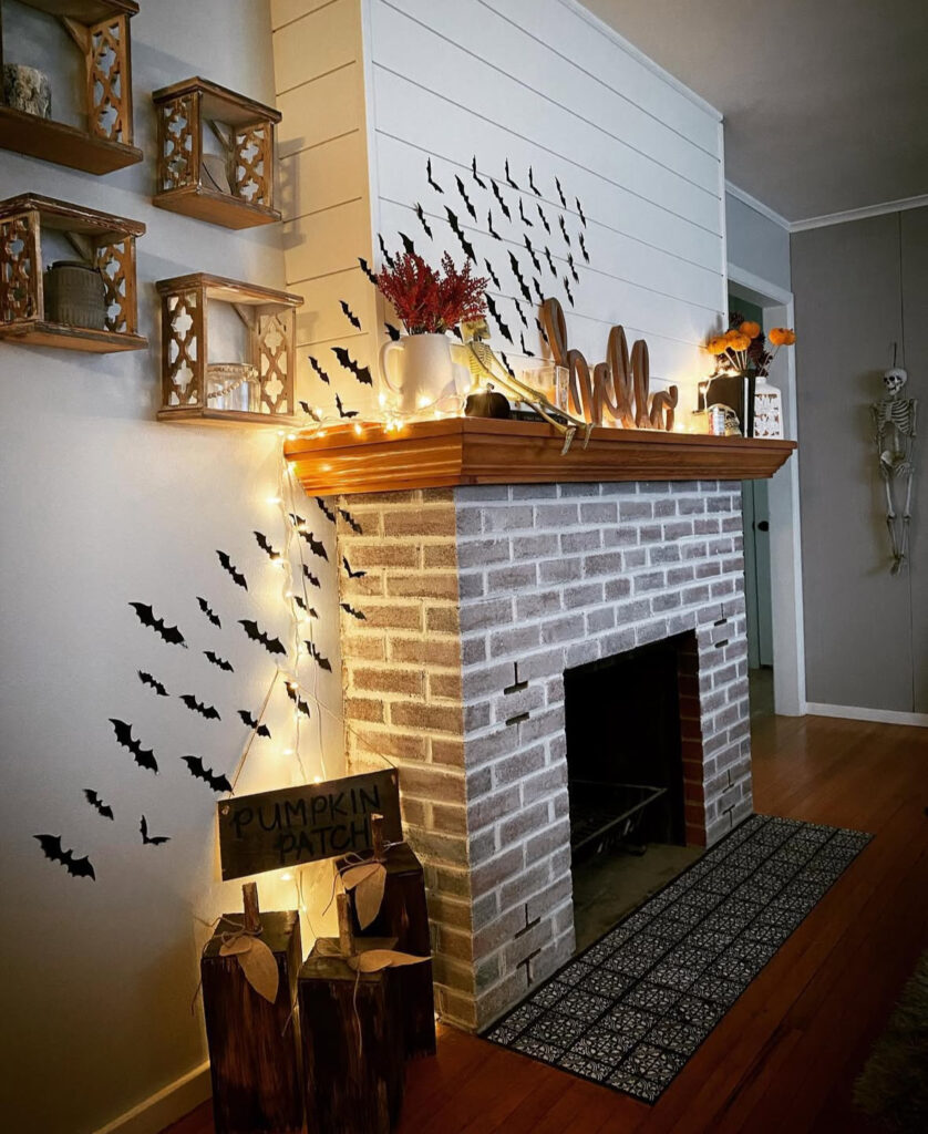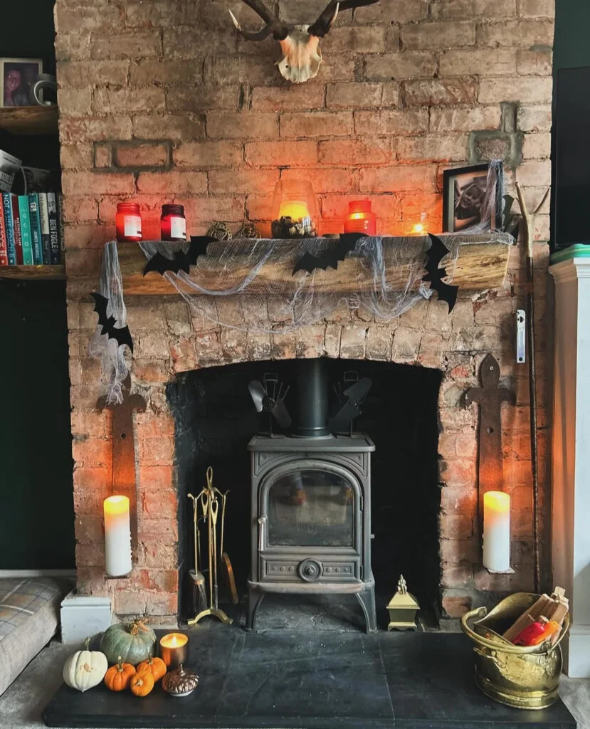 A wood beam, crisp brick, and a cheeky banner set the stage, while that triptych of skeletons delivers the memeable punch line. It’s the stripped-back, graphic version of fireplace Halloween ideas that’ll age well past November.