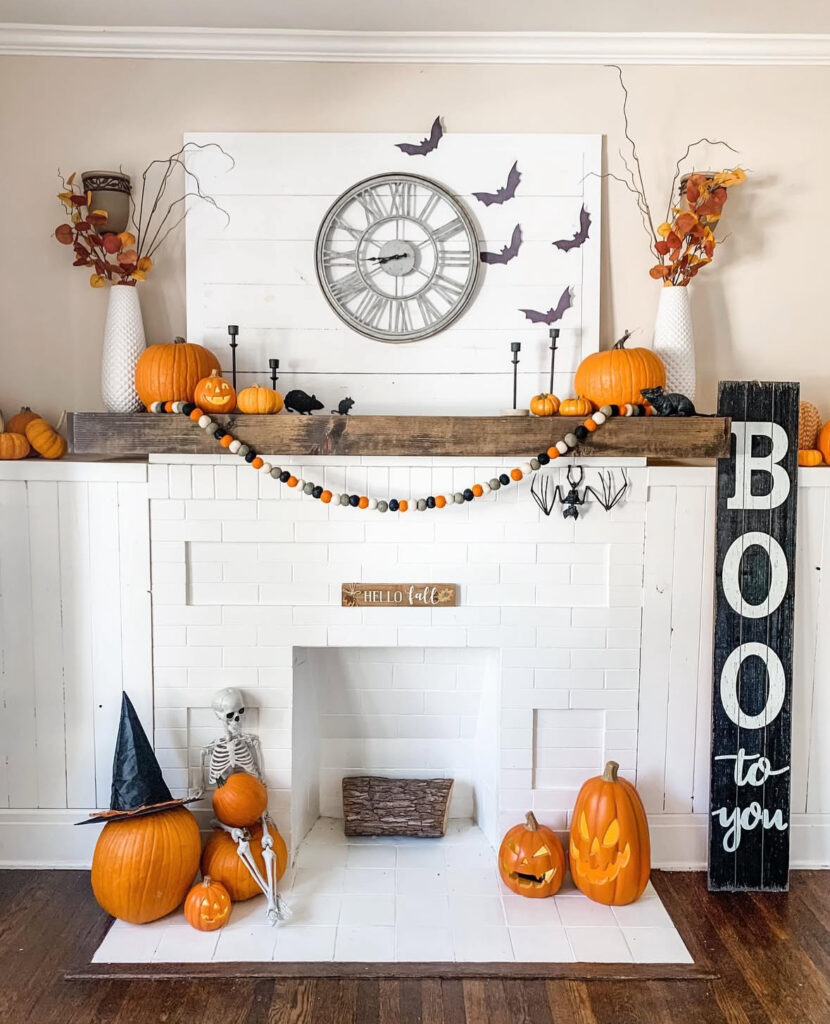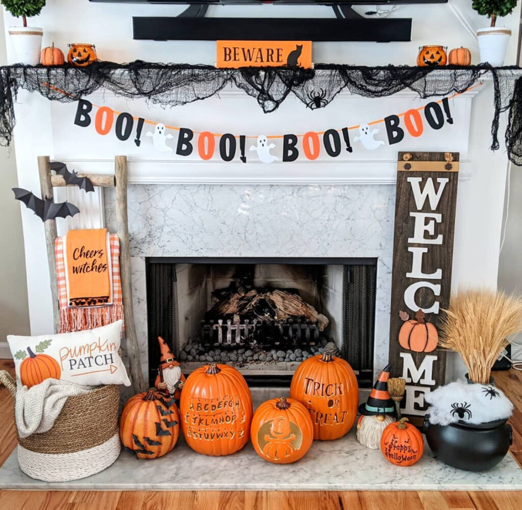 The BOO garland and candy-orange pumpkin lineup read like a parade against cool Carrera. If you’re hunting fireplace decorating ideas that are big on cheer and low on crafting, this is your north star.