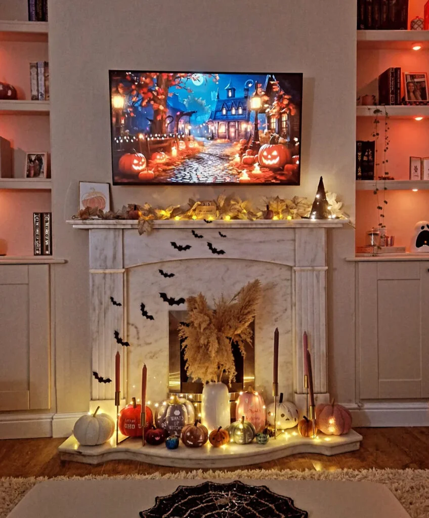 Brass candlesticks, a quote board, drifting bats, and a garland of greens set the stage, then a snowdrift of white pumpkins piles up by the hearth for maximum harvest drama. It’s a crowd-pleasing take on Halloween decorating ideas for fireplace that reads fresh now and still cozy in a decade.
