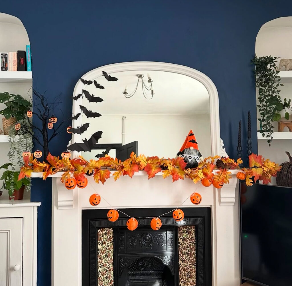 Against that saturated blue wall, the white arch mirror and a parade of paper bats feel extra graphic—like October went couture. A leafy garland and pumpkin string lights add the friendly mischief that keeps it whimsical, a tidy blueprint for mantel ideas that play well with bold color.