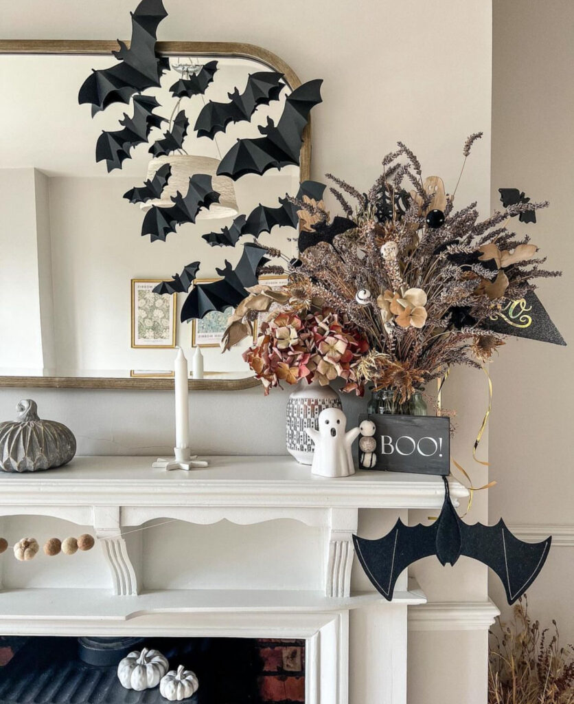 All those sculptural bats whirl off the mirror like a fashion editorial, while dried florals keep the palette warm and textural. It’s restrained but winky—exactly the vibe for Halloween mantel decor ideas that don’t shout.