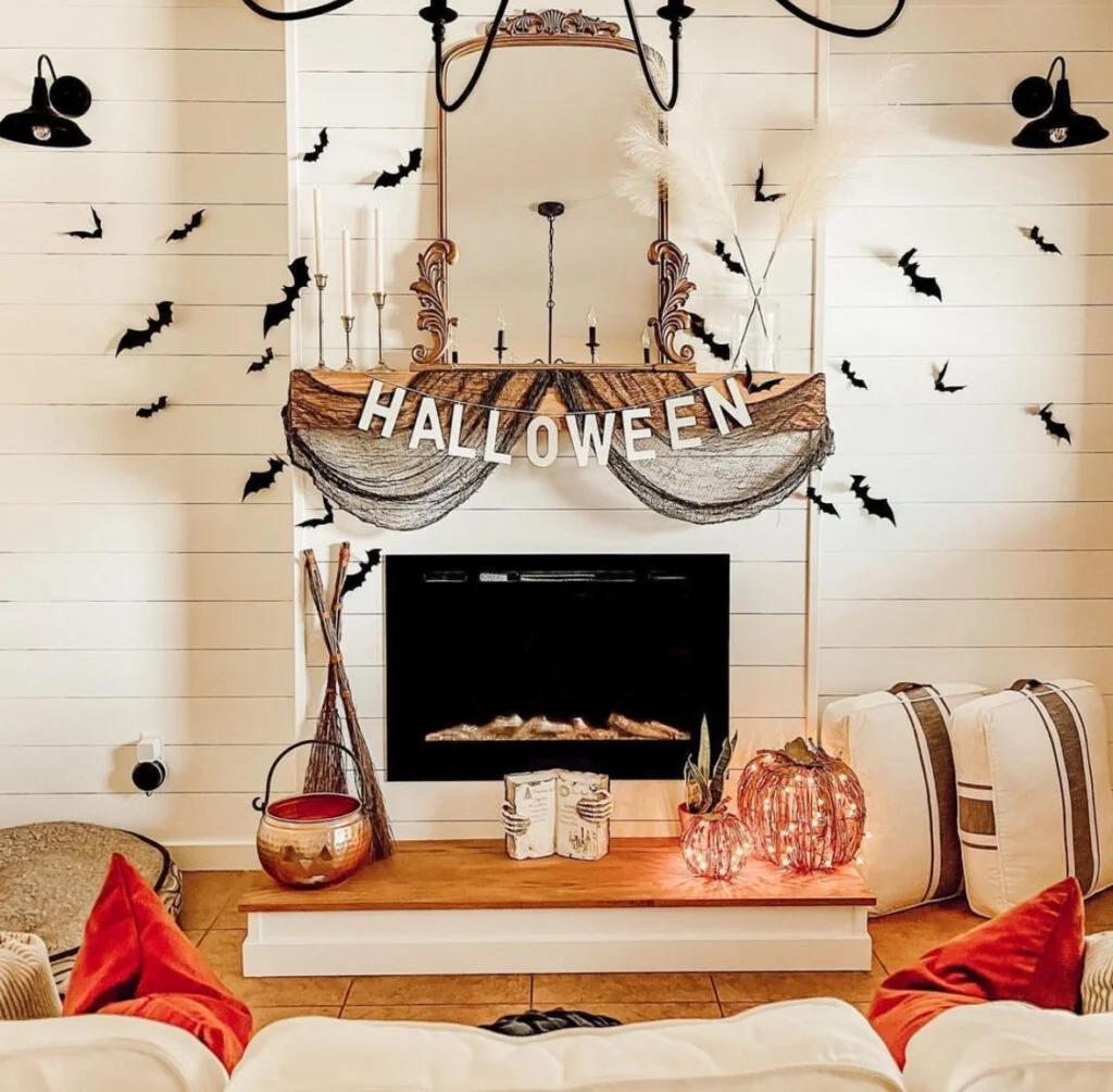 Before we start carving pumpkins, a quick PSA: your mantel is about to become the main character. I’ve been stockpiling bats, candles, and questionable props for weeks (my mail carrier has concerns), and the result is a greatest-hits reel of hearth looks with running commentary.