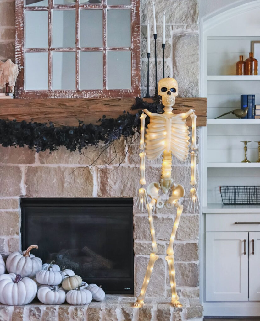 Chalky pumpkins puddle at the base while a lit-up skeleton stands sentry—campy in theory, cinematic in practice. Call it rugged romance, a blueprint for fireplace ideas for Halloween that lean moody without going messy.