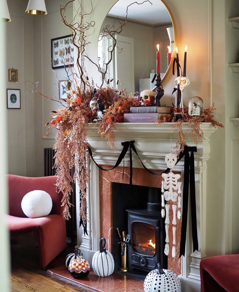 Black ribbons drape the mantel while twiggy, rust-toned stems burst like fireworks beside a classic mirror. Graphic pumpkins at the hearth keep it playful; the whole scene feels 2025 now and still charming when we peek back in a decade.