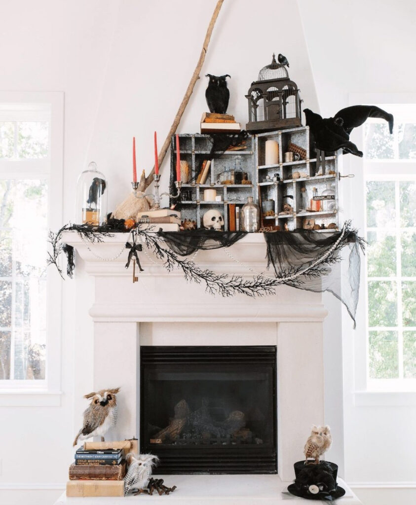 An apothecary of books, cloches, owls, and a broomstick turns the mantel into a story you want to read, with black gauze tying the whole spell together. It’s layered, textural, and just scholarly enough—the moody, collected look to pin under Halloween fireplace decor ideas.