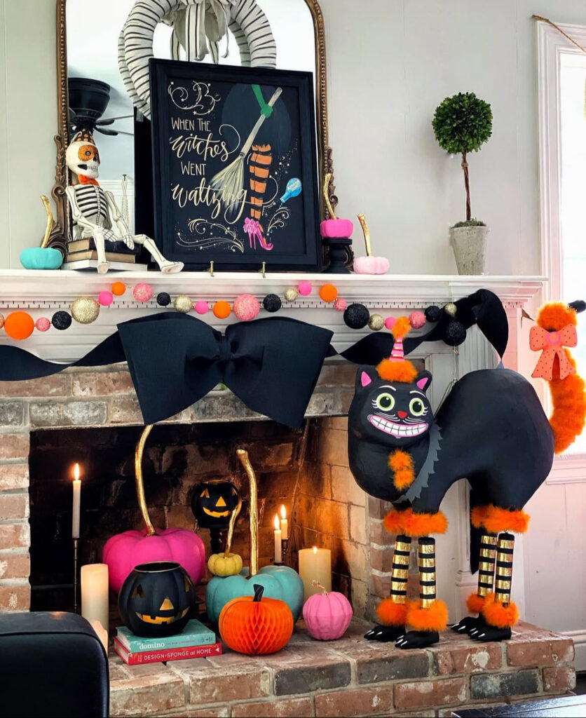 Neon gourds, a giant grinning cat, and a supersized bow take us straight to costume-party energy in the best way. It’s maximal but disciplined—smart mantel ideas for Halloween for anyone allergic to beige autumn.