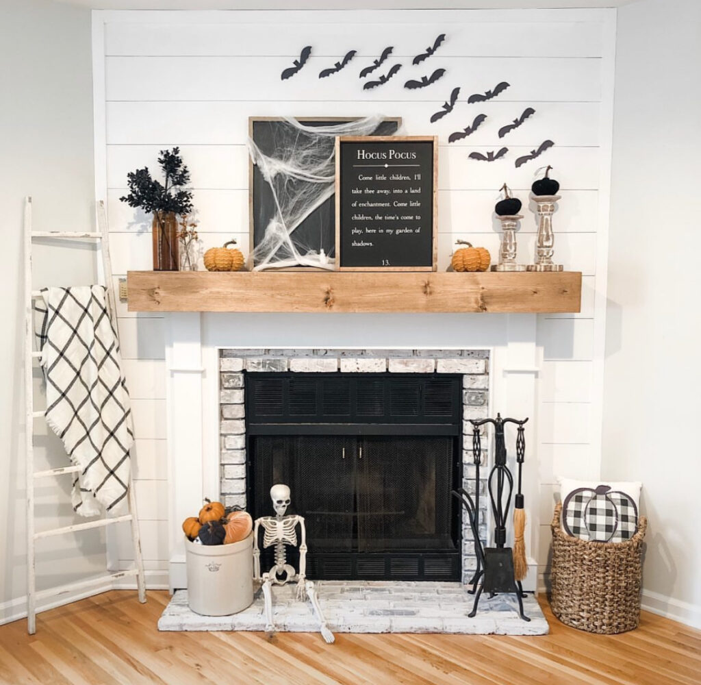 A chunky beam, shiplap, and a chalkboard incantation deliver cozy-with-a-wink; the tiny skeleton understudy steals the scene. Consider it proof that Halloween fireplace ideas can lean casual and still land the punch line.