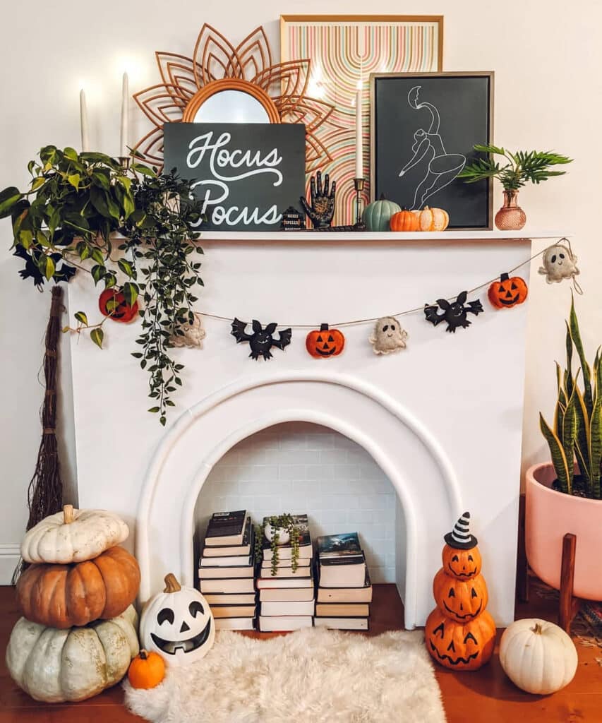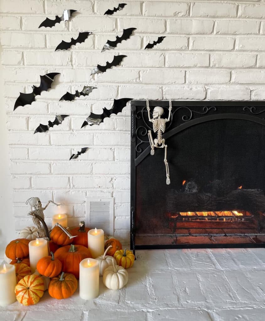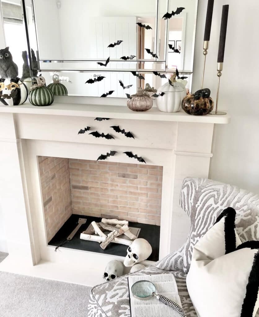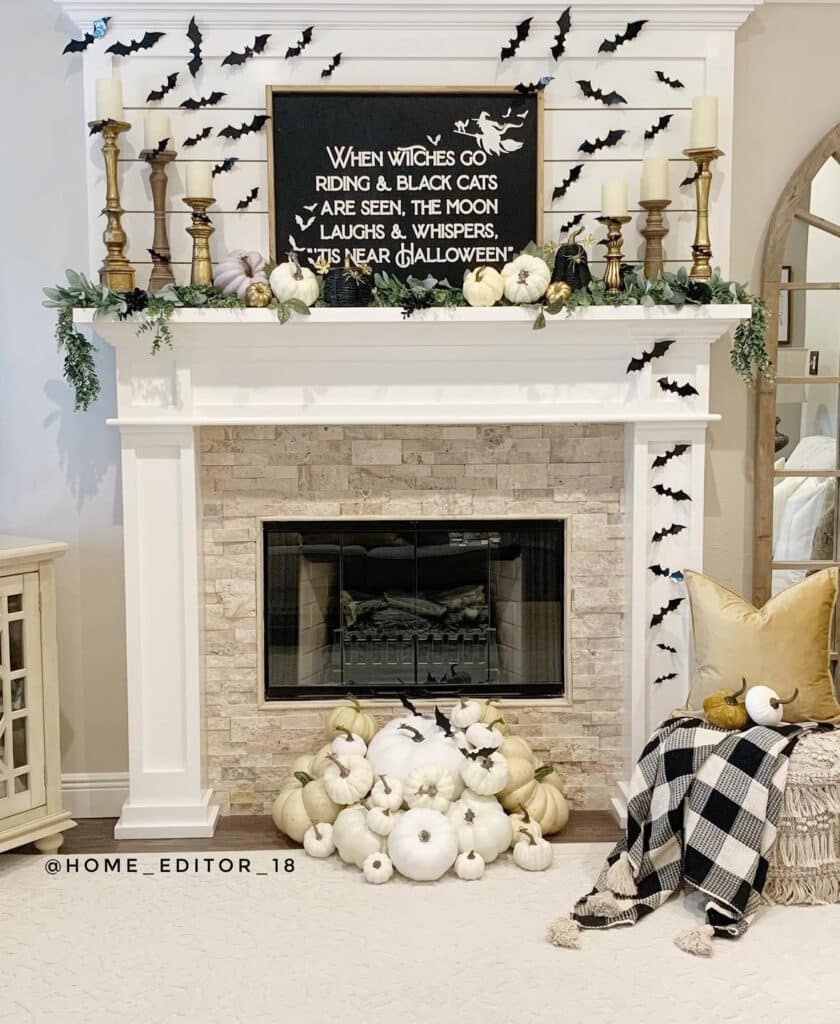 Brass candlesticks, a quote board, drifting bats, and a garland of greens set the stage, then a snowdrift of white pumpkins piles up by the hearth for maximum harvest drama. It’s a crowd-pleasing take on Halloween decorating ideas for fireplace that reads fresh now and still cozy in a decade.
