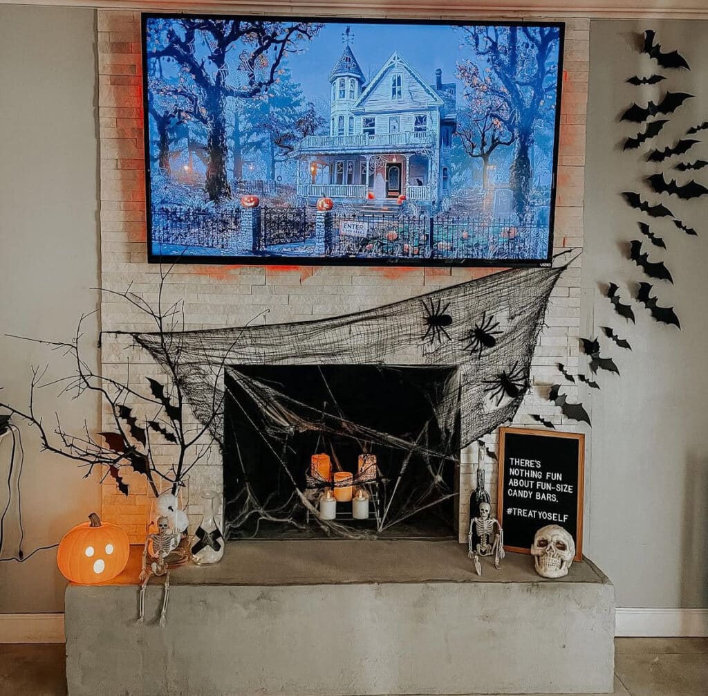 A haunted-mansion screen saver sets the tone while gauzy webs and bats create a layered vignette around concrete and brick. Letterboard snark, candle clusters, and a friendly skull round out smart fireplace halloween decorating ideas that feel modern, not messy.