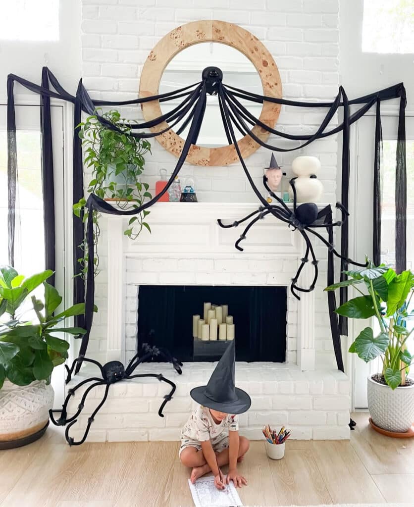 Sheer black drapery radiates from the mirror like a couture web, and those oversized spiders make the whole hearth feel delightfully theatrical. Candles corralled in the firebox keep it family-friendly, while the scene still winks at classic haunted-house drama.