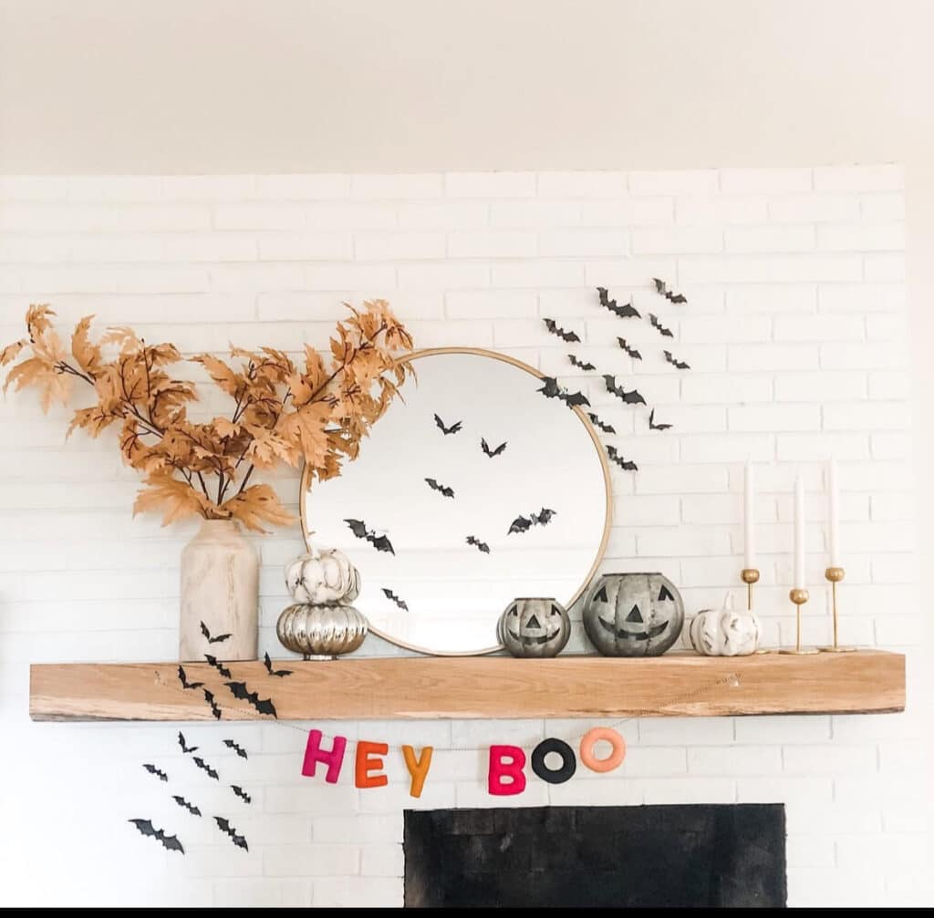 Proof that you can whisper “October” and still be heard: a round mirror, a tumble of paper bats, brass candlesticks, and one punchy banner. Consider it the mood board for simple Halloween mantel ideas that won’t hijack your living room for a month.