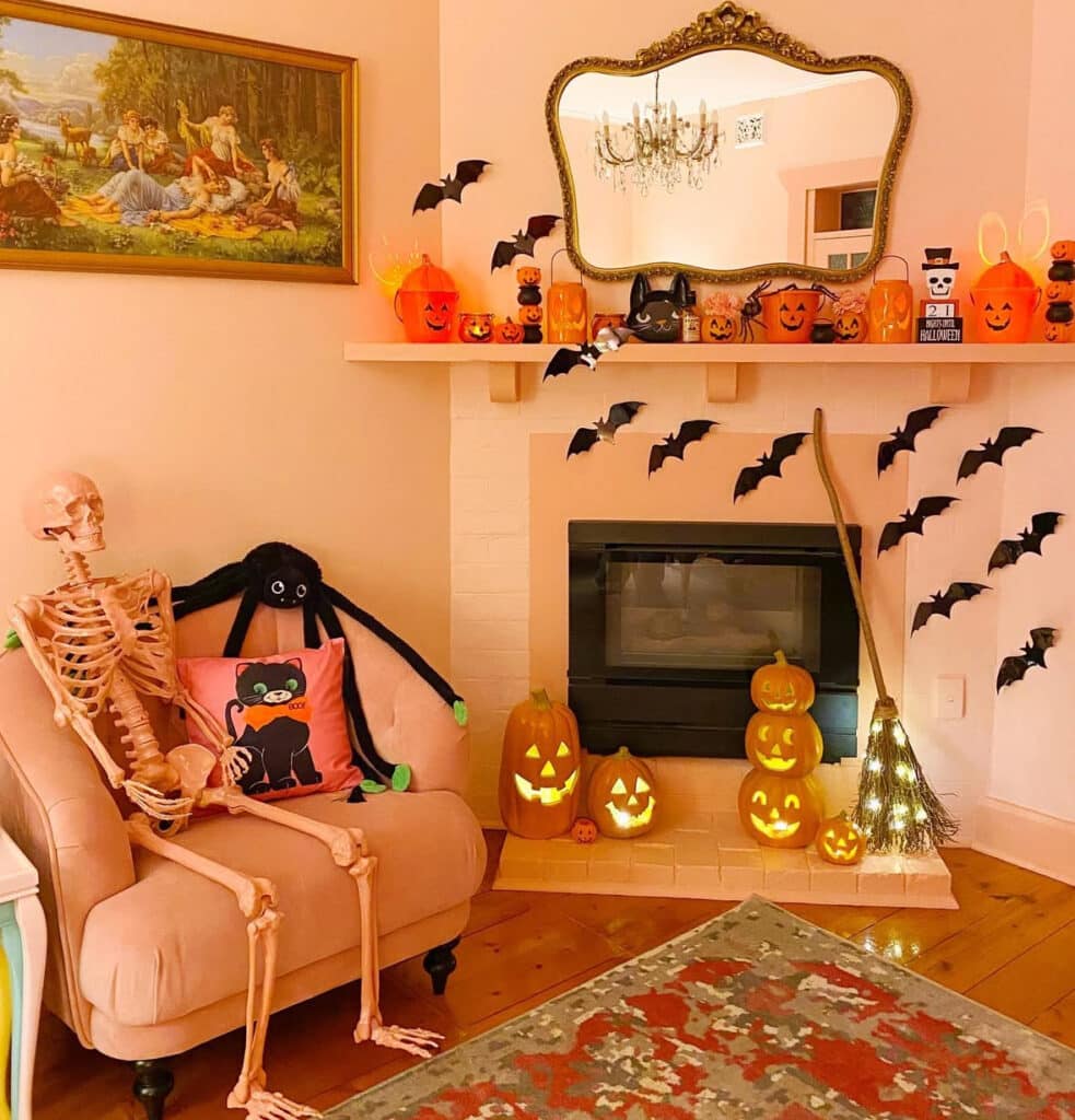A banner, a spider-web runner, and a conga line of cut-paper skeletons—this one leans camp in exactly the right way. The stacked jack-o’-lanterns do the heavy lifting, giving you an instant party vignette and a foolproof template for fireplace Halloween decorating ideas that photograph like a dream.