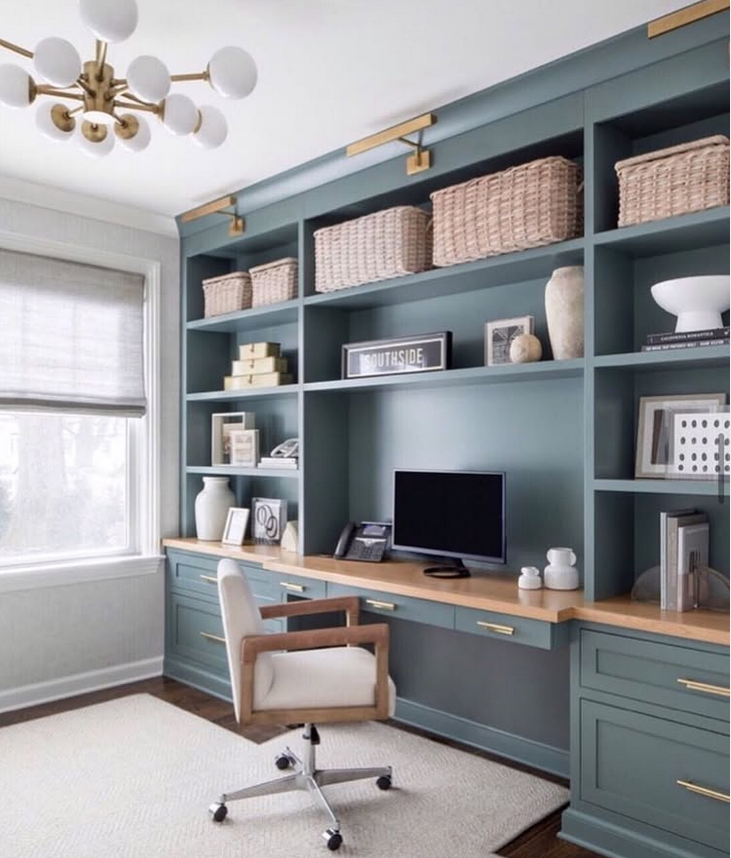 Then there’s the built-in wall situation with the blue-green shelves, baskets lined up like well-behaved little storage soldiers, and those sleek picture lights above. It’s equal parts pretty and bossy (in a good way). Like, you could absolutely take a Zoom call here and seem like the type of person who mails birthday cards on time. The brass accents and the crisp grid of shelves are doing that “organized, but still warm” thing that @seacoast_abode always seems to nail.
