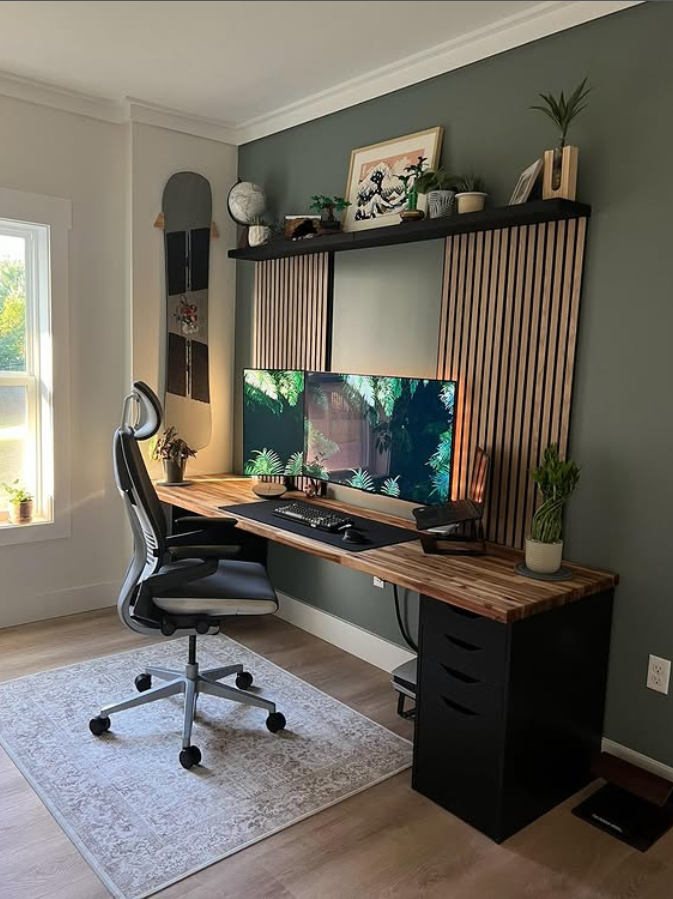 And I can’t stop thinking about that slatted wall panel behind the monitor. It’s giving “design-y” without trying too hard, and it’s secretly doing the most important job of all: making the desk feel finished even if your to-do list is… not. The vertical lines add instant structure (and somehow make the whole setup look more expensive), plus the little shelf ledge up top is the perfect “plant + art + tiny objects” zone. I saw a version of this floating around Reddit via @makerstations and yep, it’s still in my head.