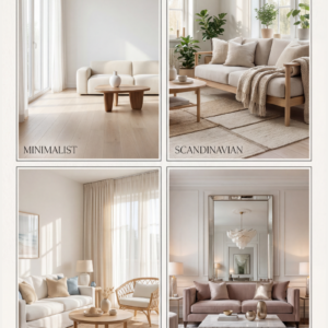- Textures: jute or wool rug + bouclé or linen sofa + stone coffee table
