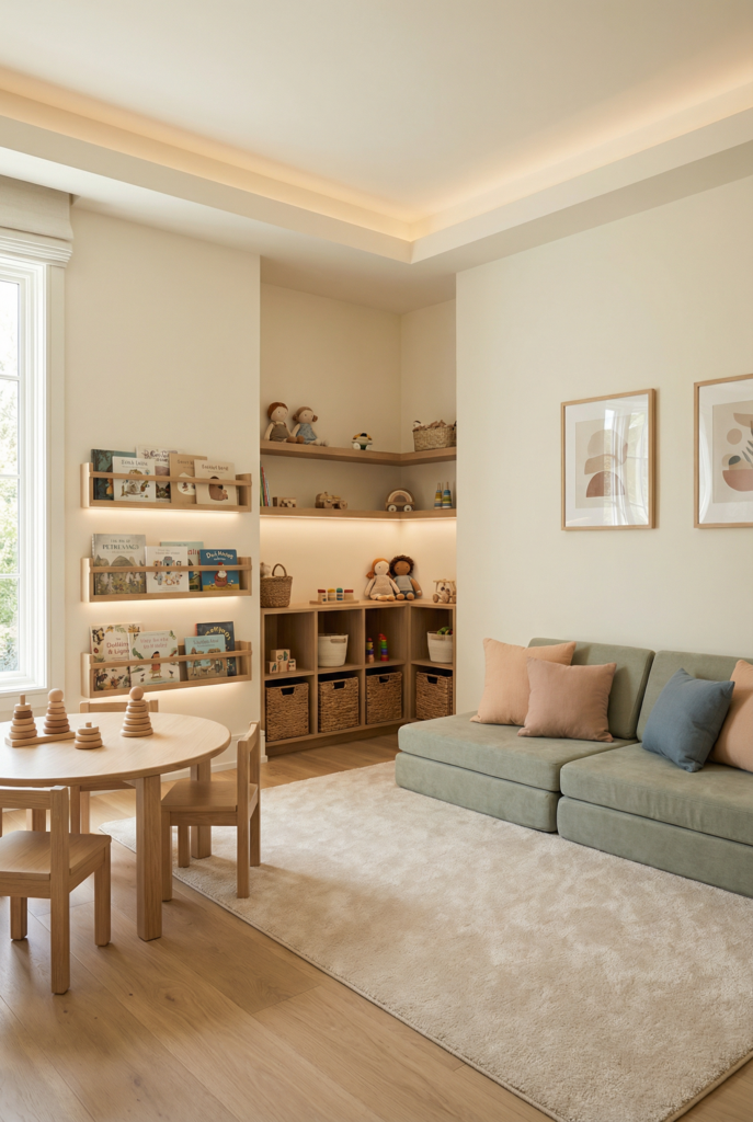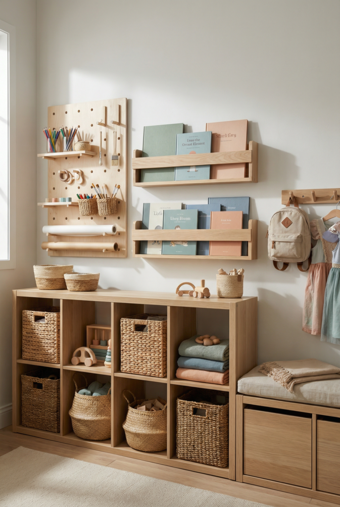 Storage is the part that determines whether you’ll enjoy this room or silently resent it at 8:45 pm when you’re doing the nightly toy sweep.