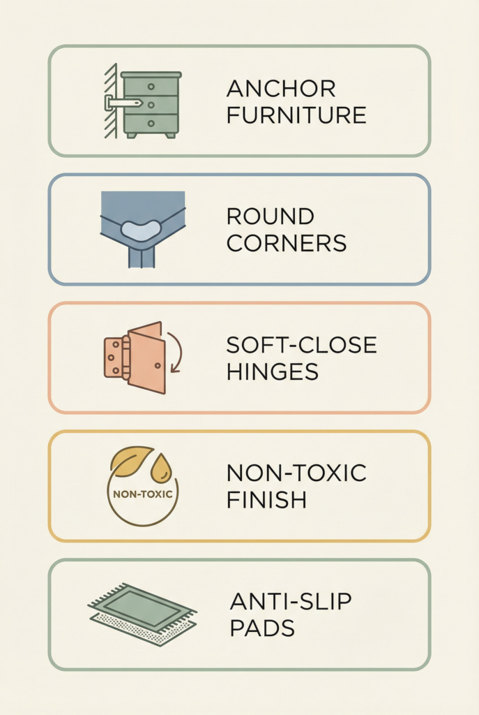 Safety first (rounded edges, tip-over risk, soft-close hinges, anchored shelves)