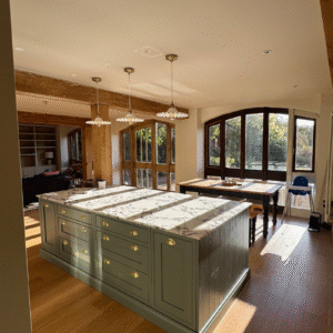 Moody green cabinetry runs the length of the room, paired with a stoney waterfall island that looks seriously chef-ready. The mix of white brick, warm beams, and long black-framed windows turns it into a sleek yet rustic backdrop for big family dinners or early-morning coffee marathons.