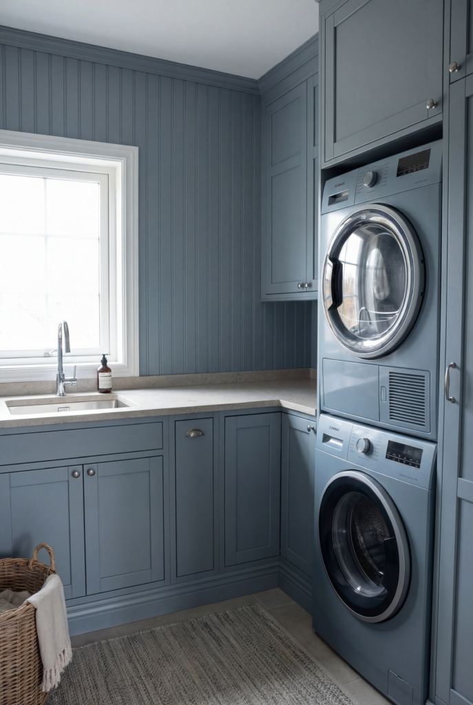 Dusty is the operative word. Not bright blue, not navy – something that sits at the intersection of blue and gray with enough white to keep it from feeling like a cave. Benjamin Moore Smoke is a gorgeous gray-blue that feels sophisticated without trying too hard. Sherwin-Williams Rainstorm is slightly deeper and more committed but still very livable. And for a windowless laundry closet specifically – paint all four walls AND the ceiling the same color, install warm light, and suddenly the fact that there’s no window isn’t a flaw you’re apologizing for, it’s just the room being exactly and intentionally what it is. That’s a move. That works.