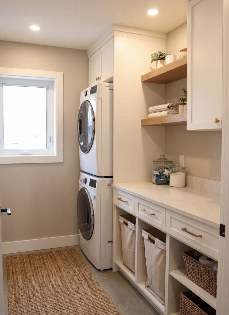 This direction is specifically for you if you have wood shelving or warm-toned hardware, because a cool white will fight with it in a way that’s hard to name but immediately noticeable and very annoying. It’s also the right call if your laundry room connects to another space – a mudroom, a hallway – and you want continuity rather than a jarring transition.