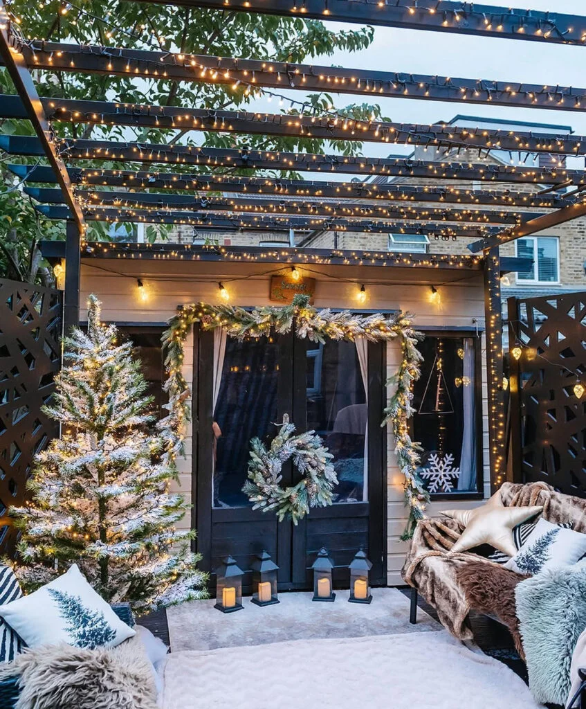 Tell me why this nook makes me want to “step out for five minutes” and then mysteriously live here forever (coffee refills itself, right?). The fur throw + lanterns + stacked logs hit that HOTEL-LEVEL COZY without screaming, and the mirror-star moment doubles the sparkle. Proof that elegant outdoor Christmas decor can be soft, not shouty.
