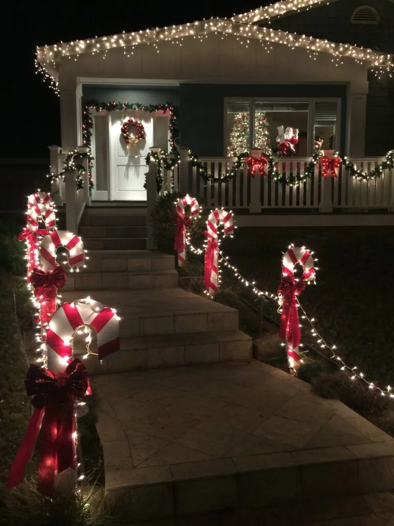 Candy-cane stakes marching up the steps, garland on duty, and icicles tracing the roofline—CHEER FACTOR: HIGH. It guides guests like a runway, only sweeter. Bookmark this for outdoor decor ideas that read festive from the curb.