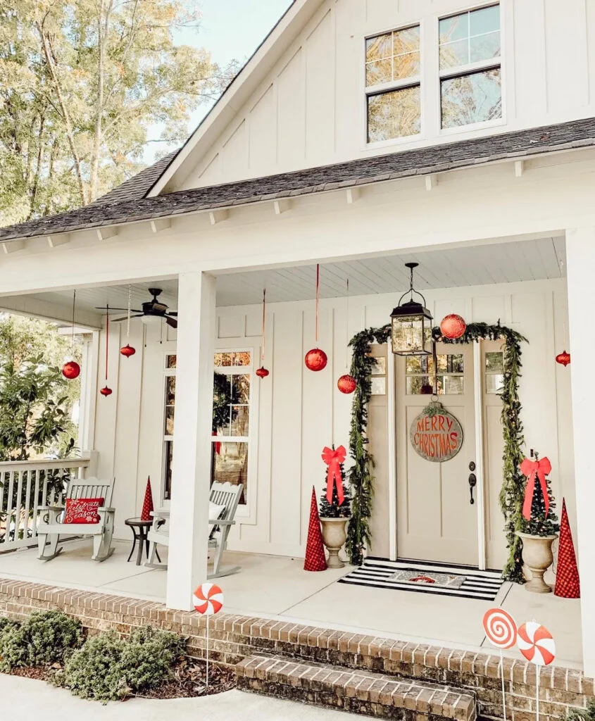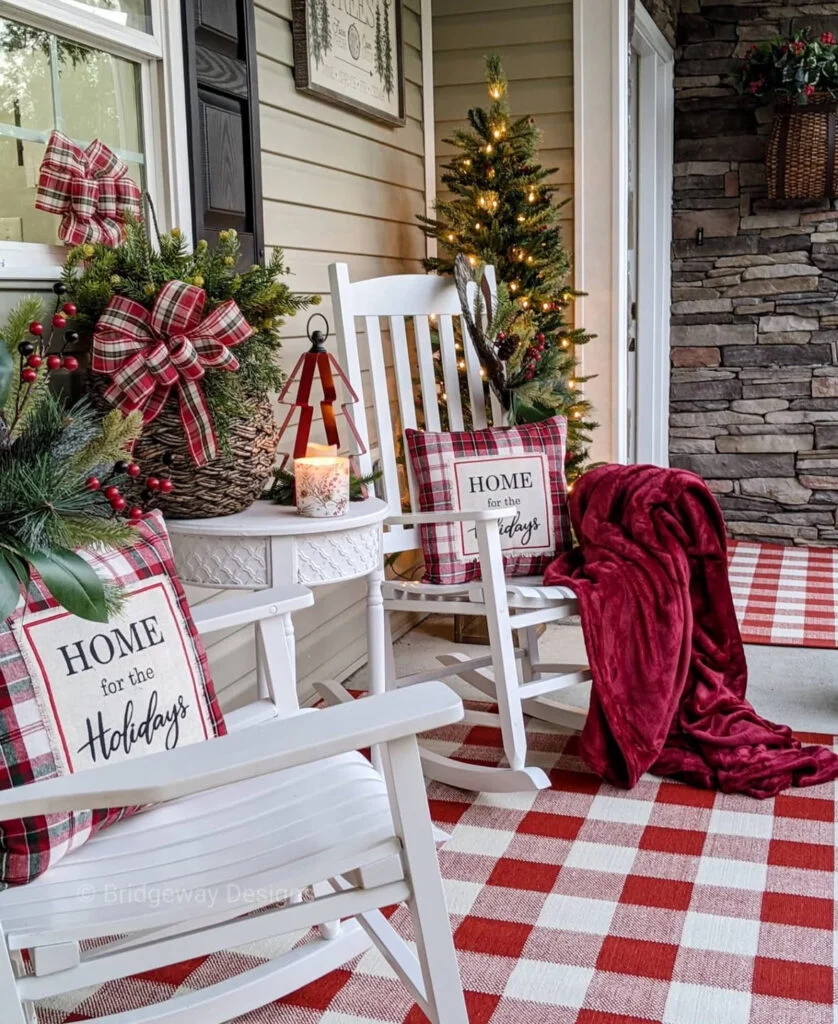 Plaid bows, gingham rug, rocking chairs—tell me you don’t hear carols the second you sit down. The little tree and lanterns keep it twinkly without turning it into a light show (balance!). Peak farmhouse outdoor Christmas decor that feels lived-in and welcoming.