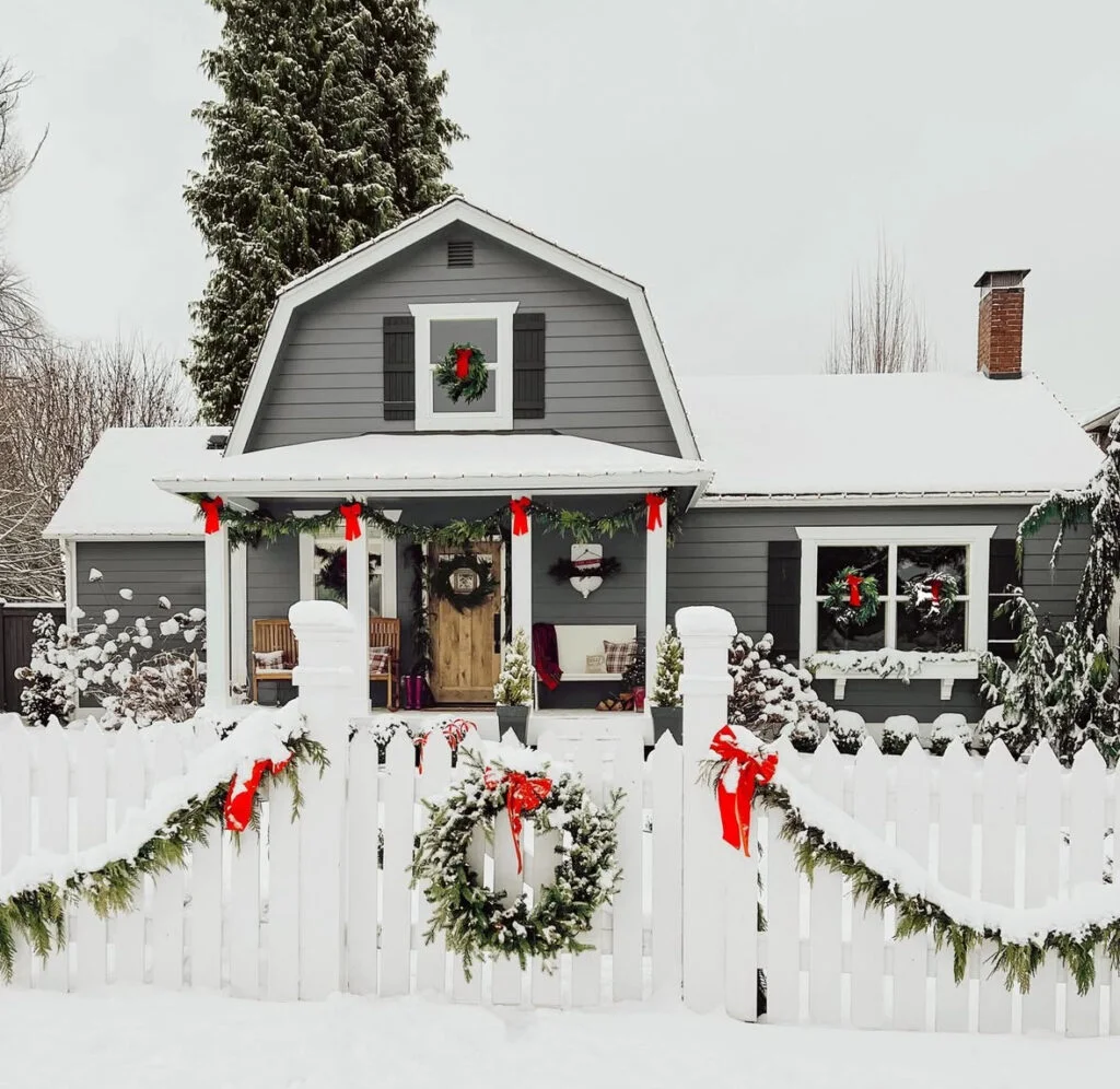 Garland along the eaves, bows at attention, and a fence wreath that says “we shovel, then we sip.” It’s classic cottage Christmas, but tighter and brighter (no blowups needed). The whole place looks like it’s mid–holiday card photo, which…accurate.