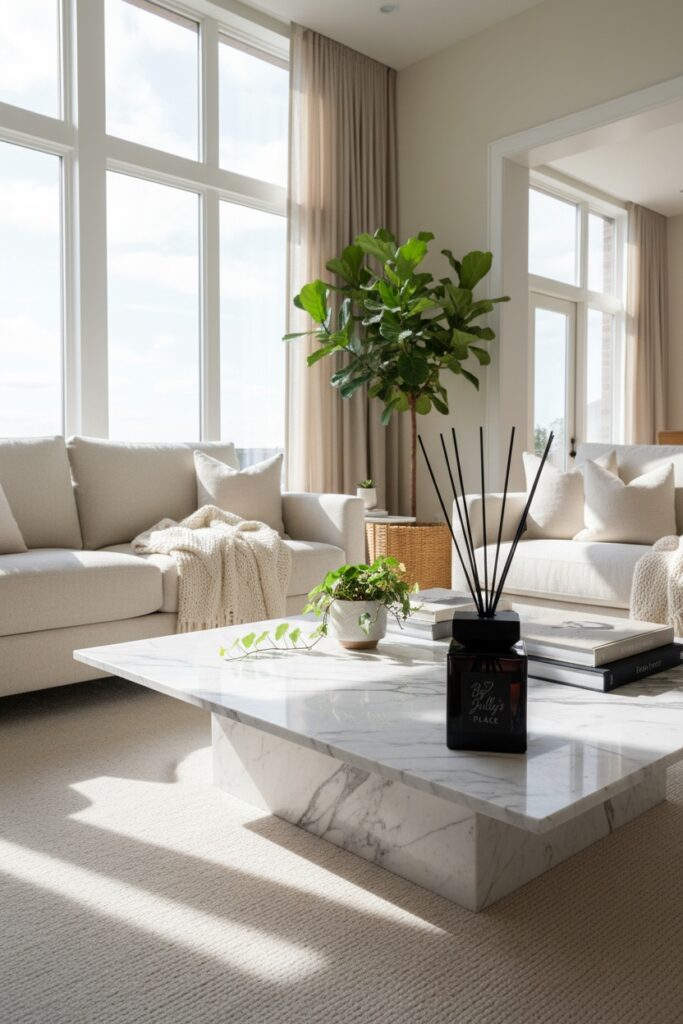 I keep swearing that if I ever write a manifesto on calm, it’ll start with a room like this—low marble, big windows, and exactly one plant proving it can handle responsibility (unlike my inbox). The light does most of the heavy lifting, and I’m not mad about outsourcing; the rest is just texture and deep breaths, IMHO.
