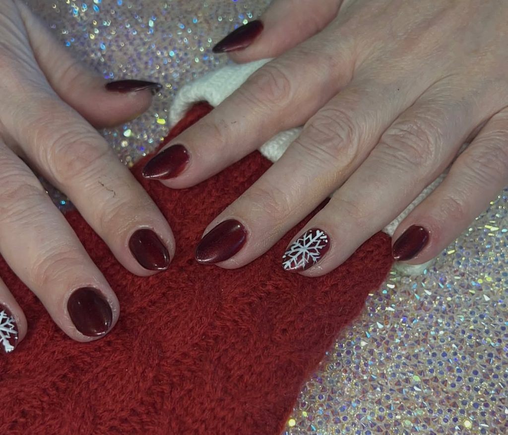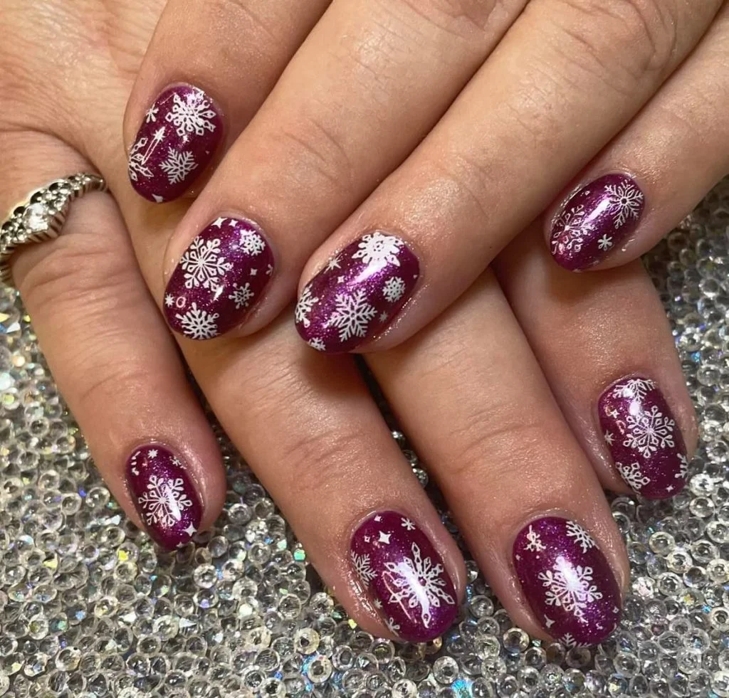 That rich merlot base with white flakes is pure celebration—December in a bottle. Stamped motifs keep it crisp and repeatable; high shine does the rest. Want Christmas snowflake nails that pop under party lights? Here’s your RSVP.