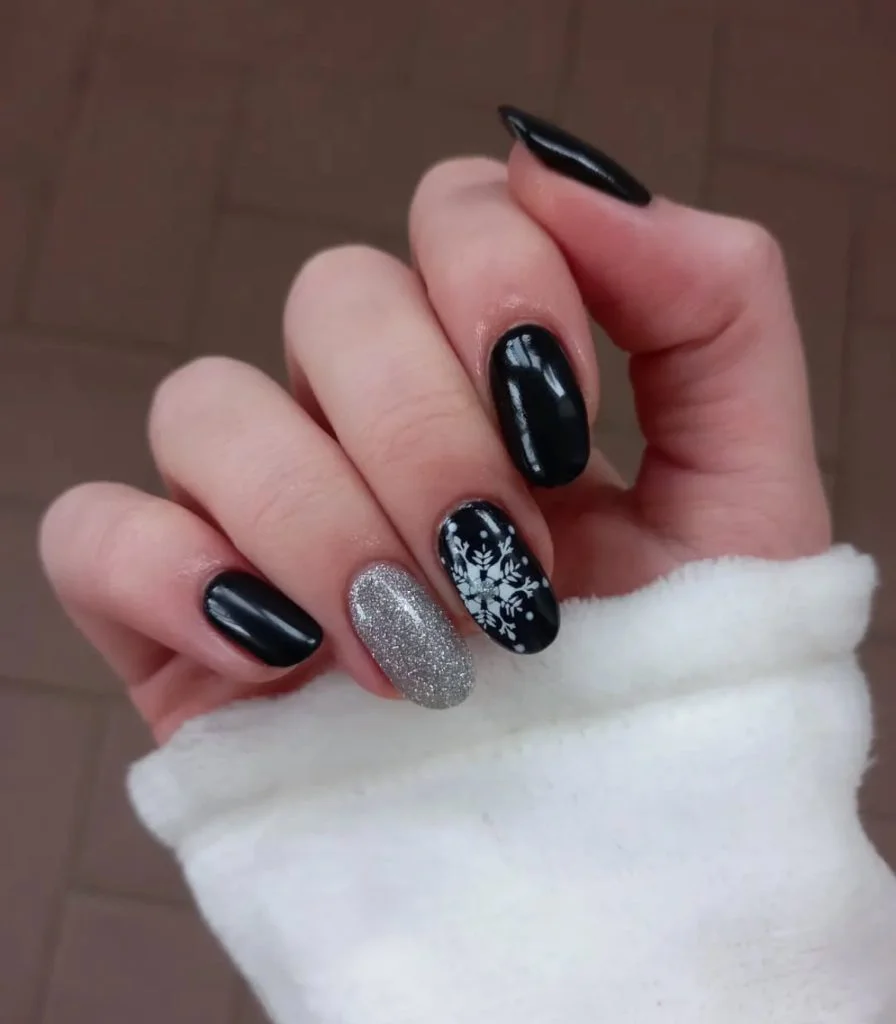 Glossy black, one silver-glitter accent, and a single statement flake—minimalists, assemble. It’s sleek, a little moody, and perfectly balanced (who needs more when one snowflake says it all?).